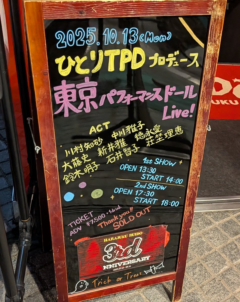 \\💃Today's Live🎡// 10/13(月) ひとりTPDプロデュース 東京パフォーマンスドール Live! ACT:川村知砂/中川雅子/大藤史/新井雅/徳永愛/鈴木明子/石井智子/荘埜理恵 OPEN/START 【1st】13:30/14:00 【2nd】17:30/18:00 \✴︎THANK YOU SOLD OUT✴︎/ 当日券の販売はございません。 pic.x.com/Oxgtfq9sIL