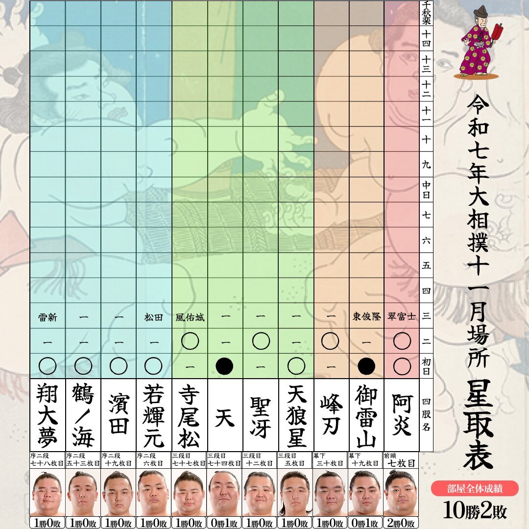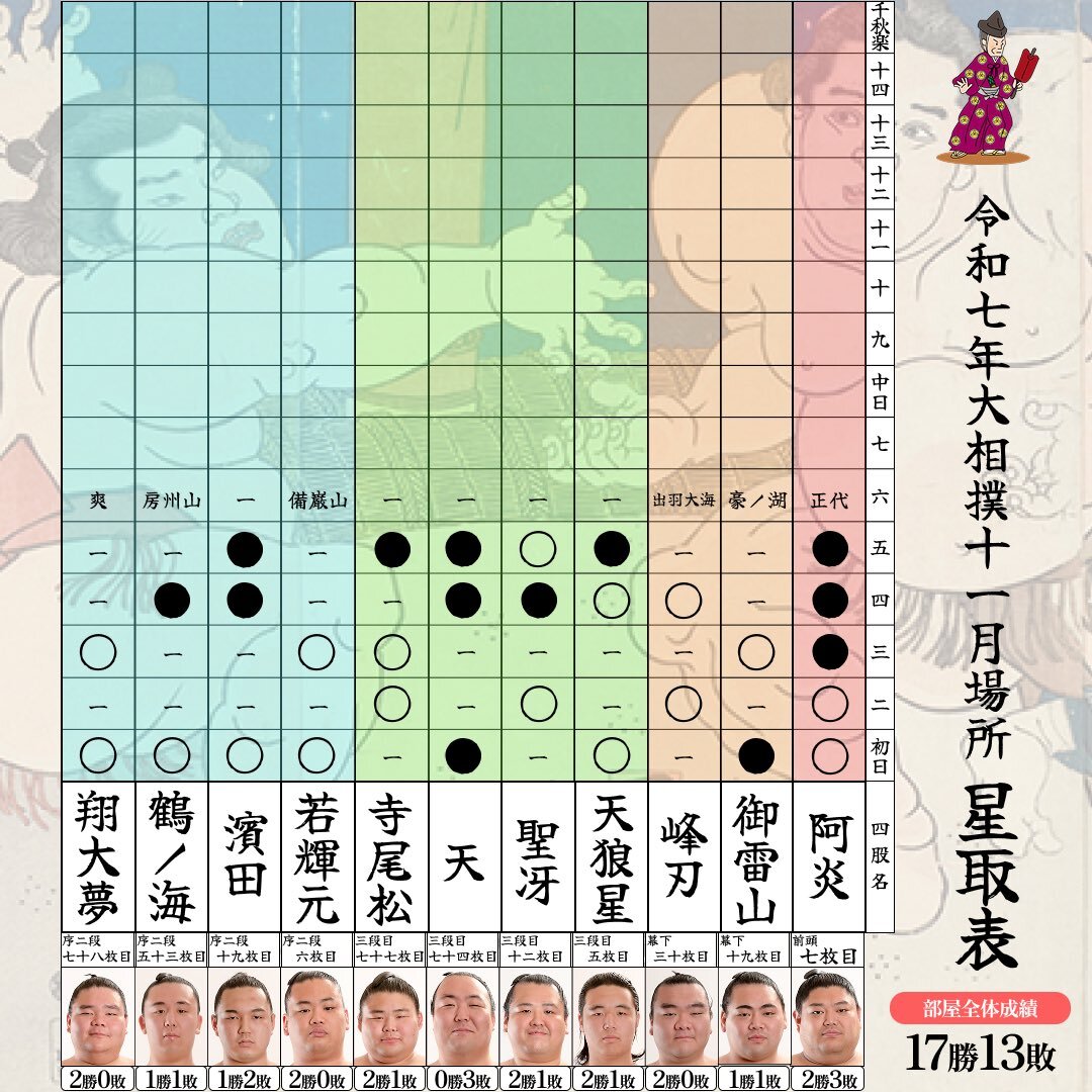 今日は、錣山部屋の阿炎関、峰刃さん、聖冴さん、寺尾松さんが揃って白星で勝率100パーセントでした。 仕事場からの帰路で峰刃さんや聖冴さん、寺尾松さんの相撲をYouTubeで観てガッツポーズ、NHKプラスで阿炎関の勝利を観てめちゃくちゃ嬉しかったです✨🙌✨ #錣山部屋全力応援 pic.x.com/8OmTVu1LAn