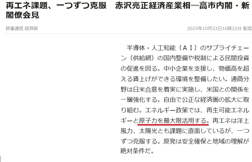 再エネ課題、一つずつ克服 赤沢亮正経済産業相―高市内閣・新閣僚会見 2025年10月22日 jiji.com/jc/article?k=2… #自然破壊 #環境破壊 #環境汚染 #放射能汚染 #原発反対 #汚染水 #自然エネルギー pic.x.com/nQHeJy792d