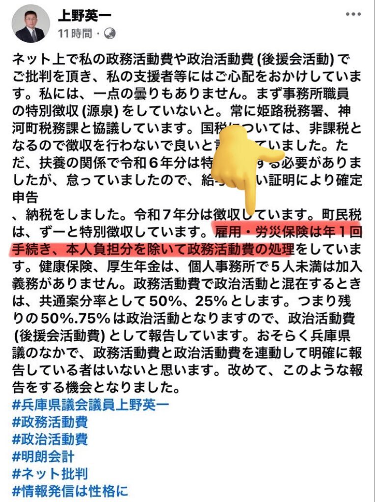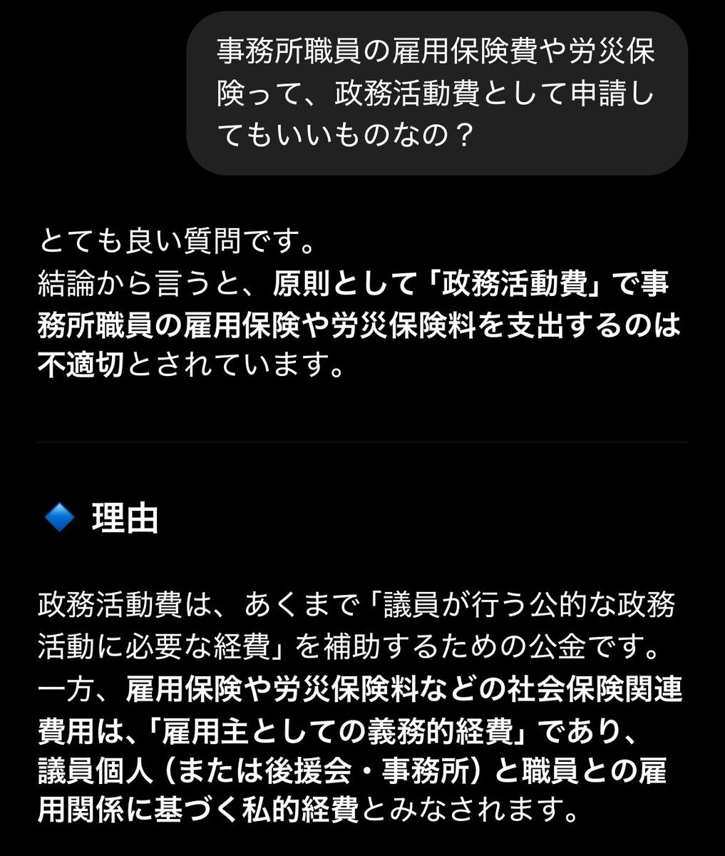 ってかあれ?? 上野県議、「雇用・労災保険は年1回手続き、本人負担分を除いて政務活動費の処理」て書いてるけど、大阪府、東京都、神戸市議会などの例でも、 「社会保険料、雇用保険料、労災保険料等は政務活動費の対象外」と明記されているみたいやけど、大丈夫そ? #明朗会計 #情報発信は正確に pic.x.com/CYu6uc49O9