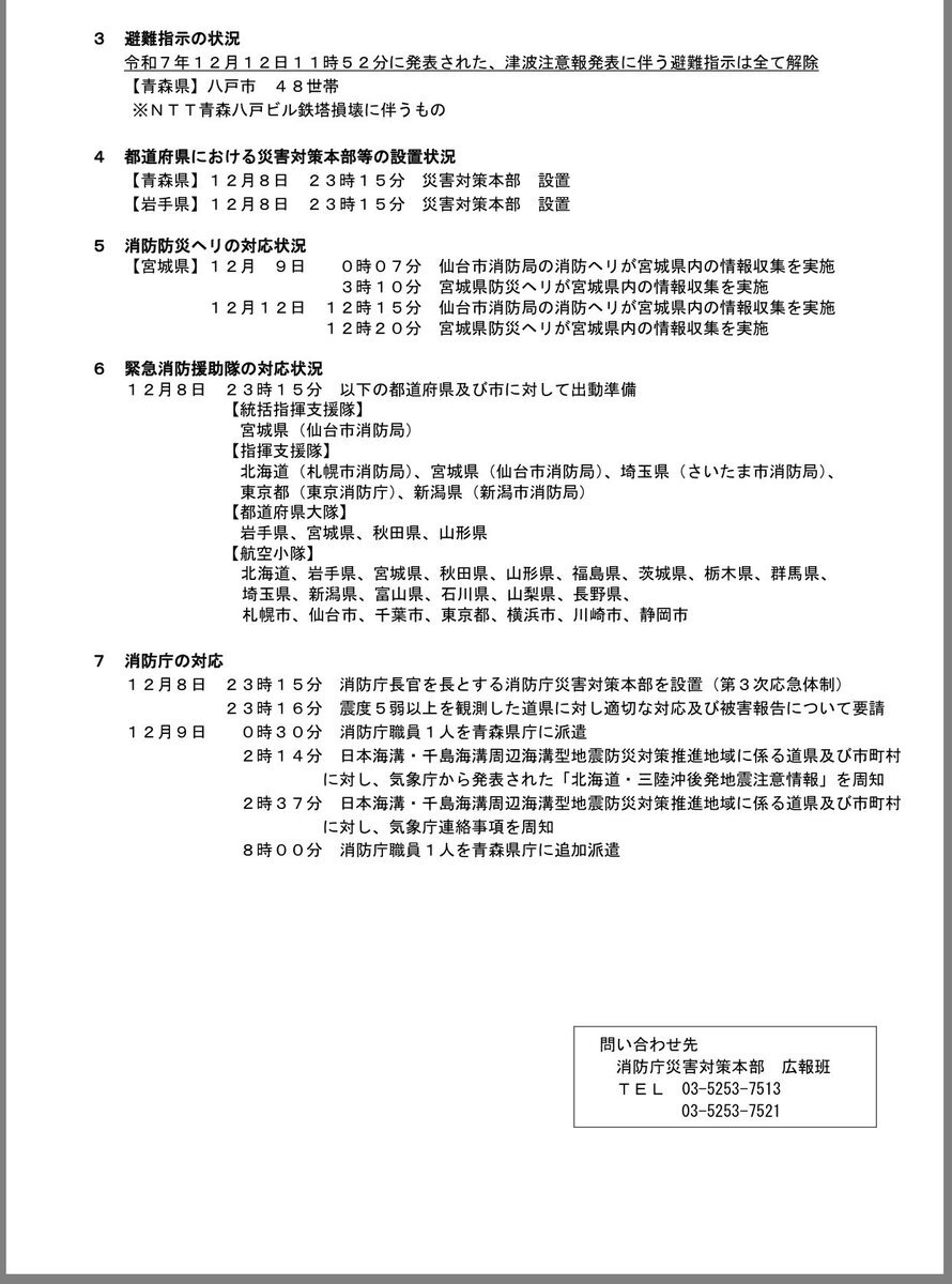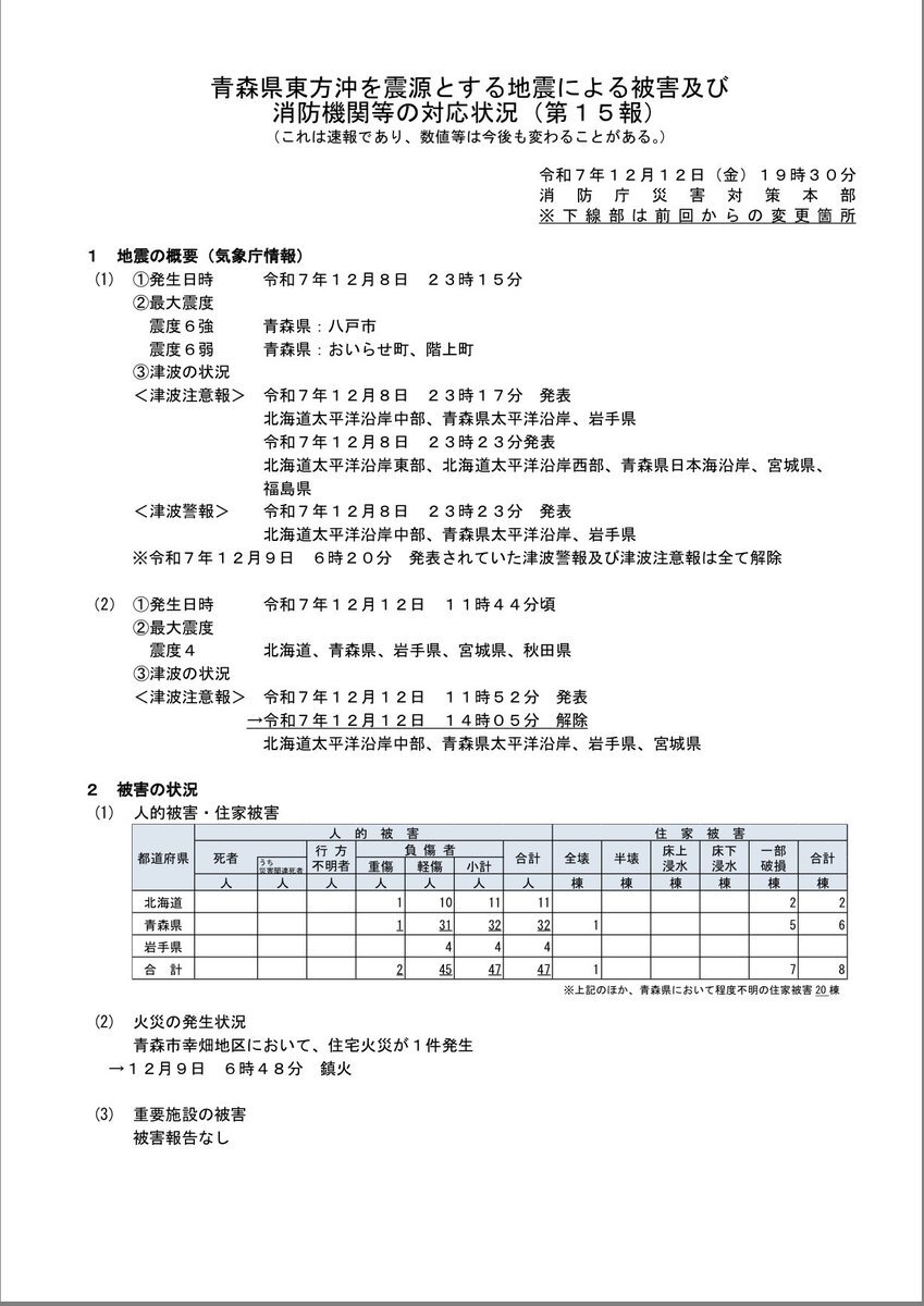 【第15報|青森県東方沖地震】 消防庁が最新の被害状況を公表。 ■12/8発生(最大震度6強) 青森県八戸市で震度6強。 おいらせ町・階上町で震度6弱。 津波警報/注意報は9日6:20に全て解除。 ■12/12発生(最大震度4) 北海道・青森・岩手・宮城・秋田で震度4。 津波注意報は12日14:05に解除。 pic.x.com/qtRoQu15al x.com/hase3655/statu…