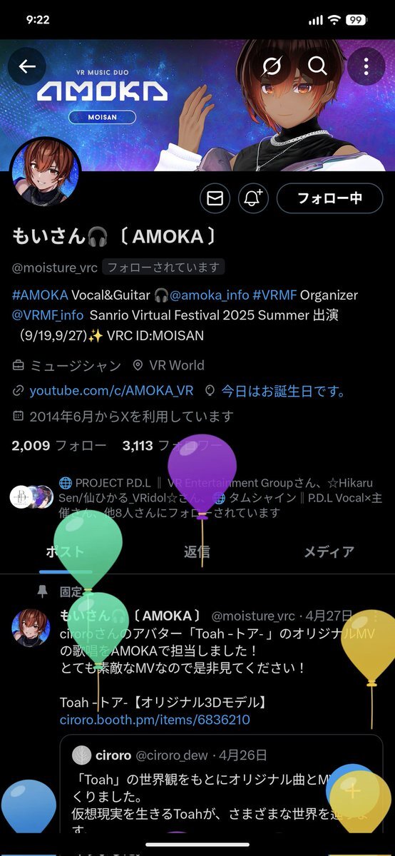 @moisture_vrc もいさん風船飛んでました!!! お誕生日おめでとうございます🎂 素敵な一年になりますように🍀 またLIVEお邪魔します! AMOKA大好きです! pic.x.com/AqAnSIBtv9