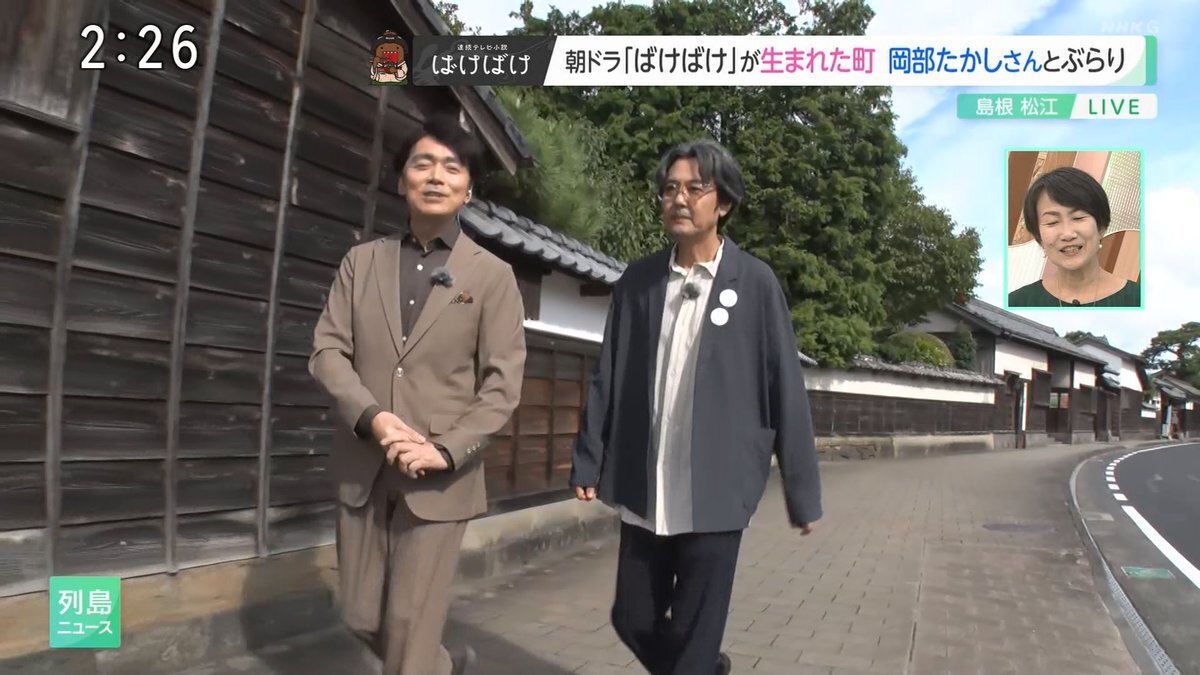 #ばけばけ【またヤマダさんに借りた?疑惑】録画してた列島ニュース鑑賞。松江の城下町を岡部たかしさんが高瀬アナと歩く街ロケ企画。服がオーバーサイズ気味。#家族に乾杯 出演回、行きつけの焼鳥屋常連のヤマダさんに衣装借りたと言ってましたよね。ヤマダさん岡部さんより少し大きい人らしいんです。