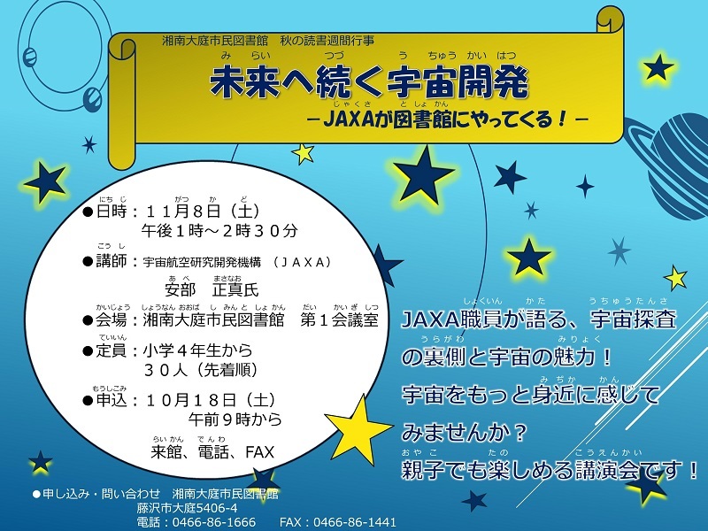 《湘南大庭市民図書館 未来へ続く宇宙開発-JAXAが図書館にやってくる!-》 はやぶさをはじめ宇宙開発のお話を聞いてみませんか。子どもも大人も楽しめる講演会です。日時:11月8日(土)、場所:湘南大庭市民図書館 第1会議室、定員:30人対象:小学4年生から #藤沢市図書館