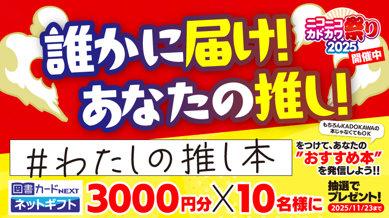 \\誰かに届け!あなたの推し!// 「#わたしの推し本」キャンペーン📚 #ニコニコカドカワ祭り 2025 開催中 👉kdq.jp/6hvah をチェック👈 #わたしの推し本 と "おススメ本"を書いて引用RP🎁 図書カードネットギフト3000円分を10名様に✨ 応募方法&規約はスレッドを確認💬 2025/11/23迄