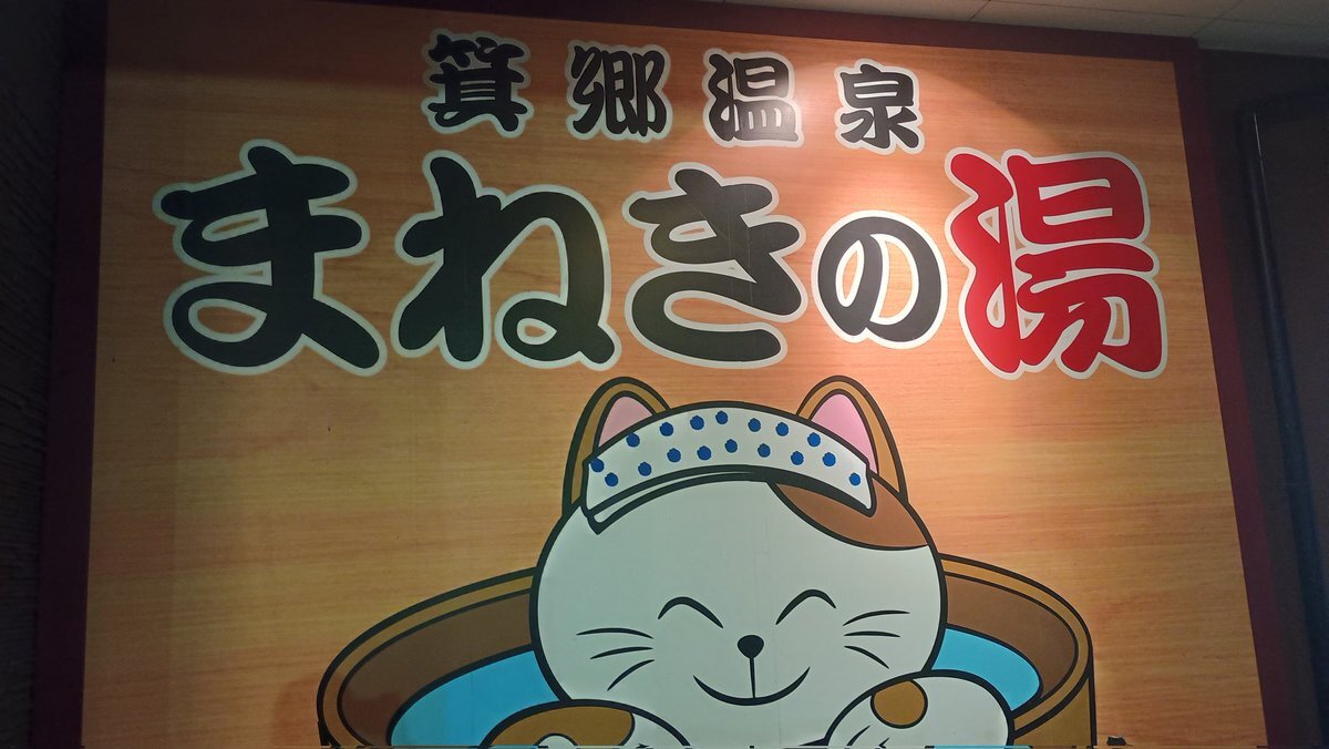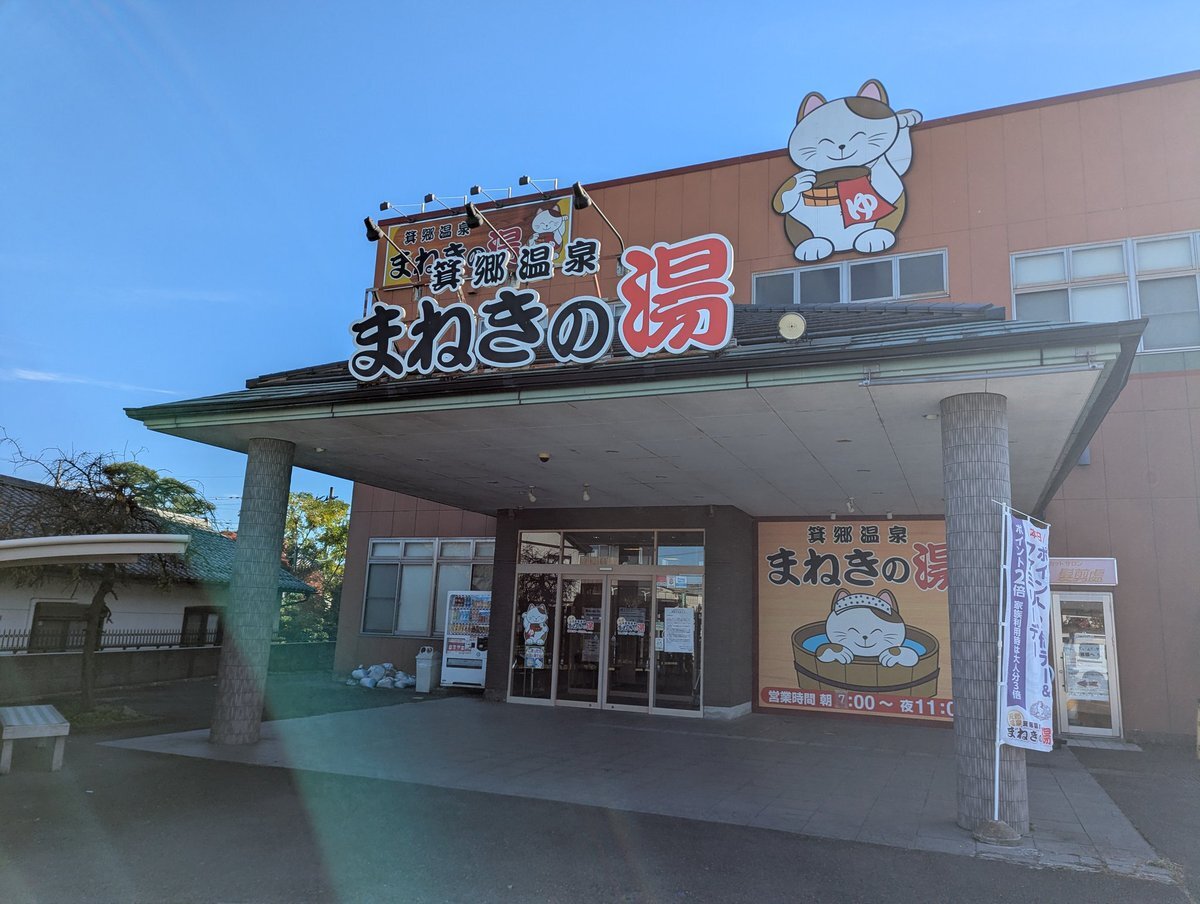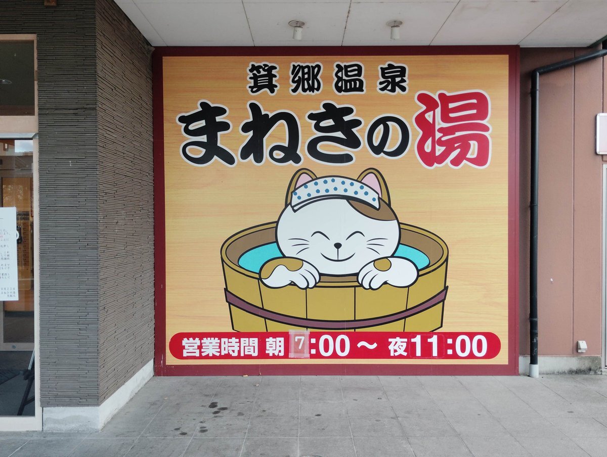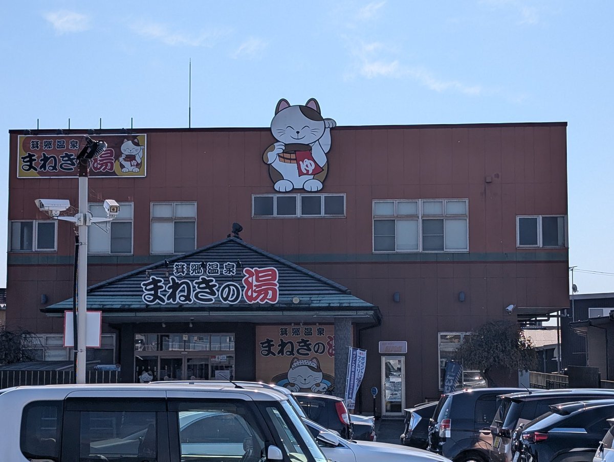 高崎箕郷のまねきの湯に来ましたわ。私と同じモチーフのネコさんが桶持って招いていますわ。よくあるスーパー銭湯的な温泉ですが、今月末で閉館とのこと。この時間でそこそこお客さんいるので何処か買い取らないかな。 pic.x.com/9nMMlEko82 x.com/ukkey_999/stat…