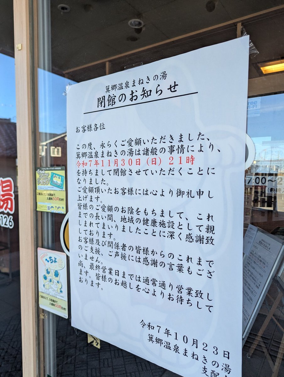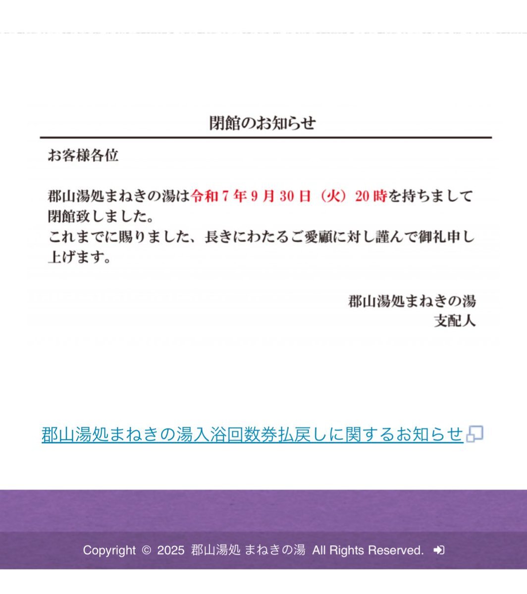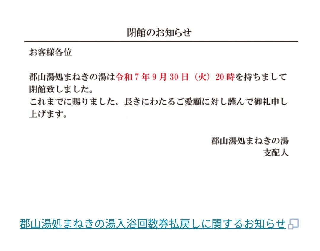 ニフティ温泉アプリのマイページにお気に入り店舗ポチリをしていたら、郡山湯処まねきの湯さんが閉館した、と知り慌ててネットサーフィン🌊 昨年の秋、水郡線(袋田の滝+道の駅♨️)+郡山泊(それでまねきの湯利用)+飯坂温泉泊で行ってたからびっくり。 まじかー また利用したかった( ;∀;)