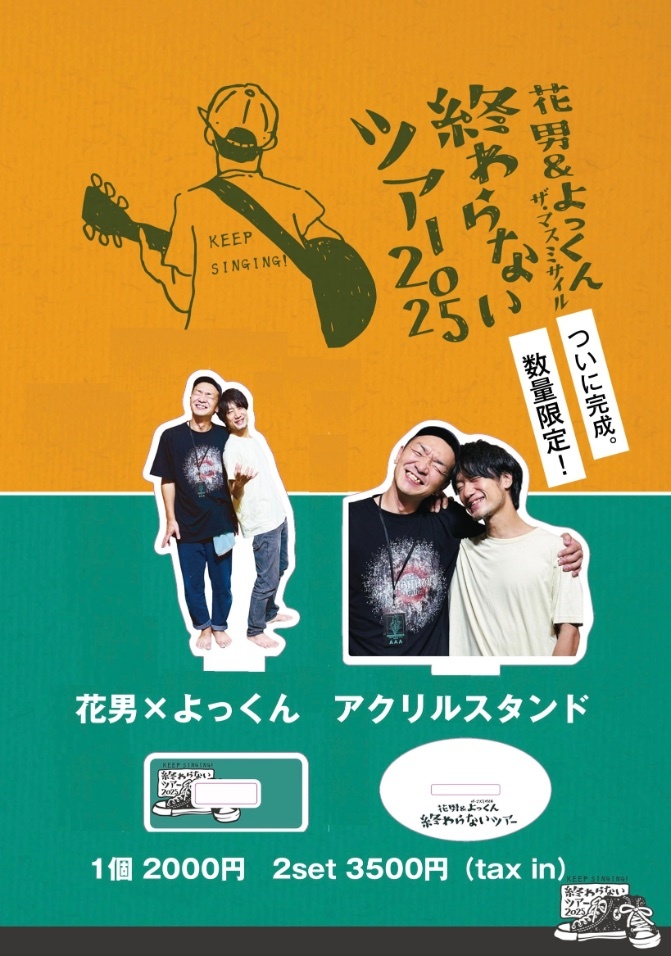 【ついに作ってしまった🎉】 花男×よっくん(ザ・マスミサイル) 数量限定 ”アクリルスタンド” 11/28高知 29高松 30大阪から お互いライブ会場限定にて販売します。 まねきの湯で撮影したんだよ♨️ #終わらないツアー pic.x.com/2OKSfGrWtv