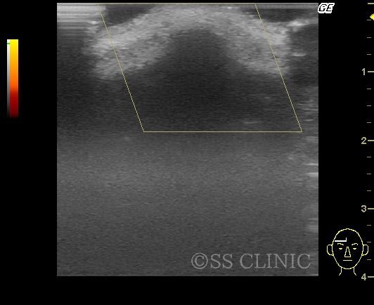 前頭骨種Osteomaの患者さんがまれに受診されます。大抵は前医で石灰化上皮腫と診断。この診断はマシなほうで、脂肪腫との診断も・・・。触るとガチガチに硬く、前頭骨と癒着。なんで脂肪腫なの❓どぼちて、どぼちて(涙)。エコー検査で骨は超音波を跳ね返すため、凸状の陰影になります。 pic.x.com/POroA5TMOn