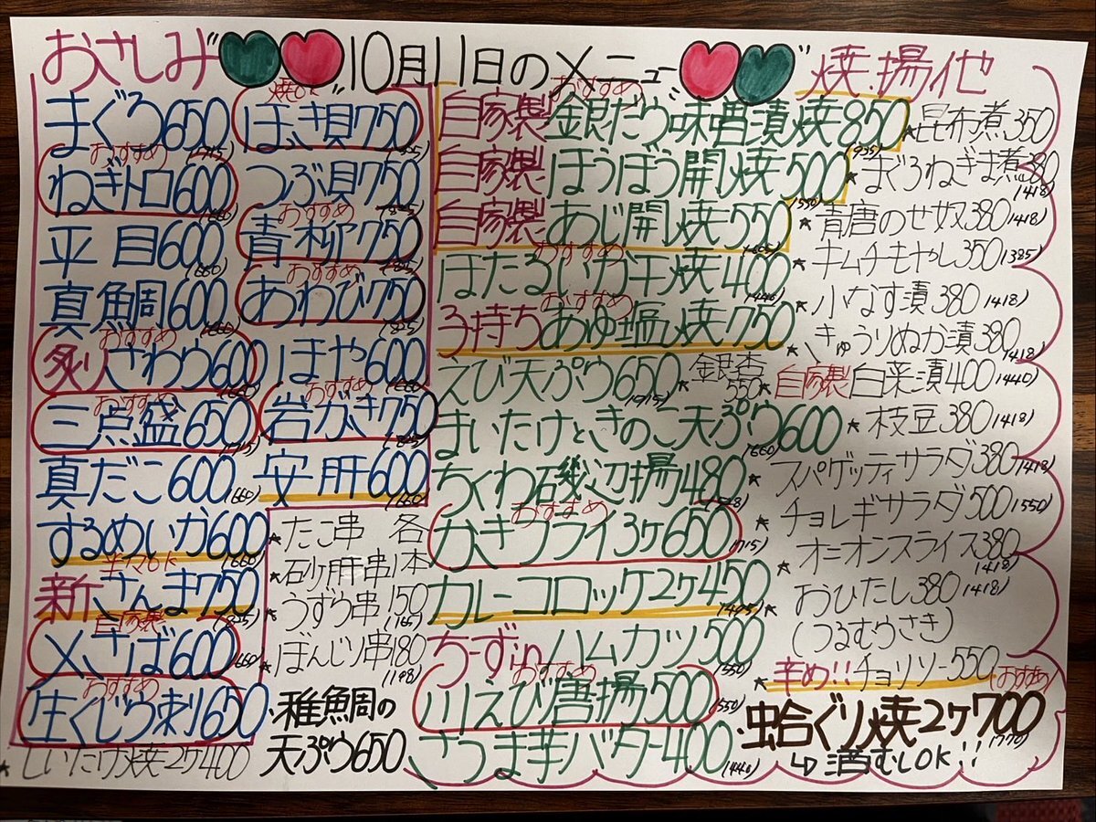 三杯呑屋けん家”メモ: 10月:あげたて厚揚げ、銀鮭のみそ漬焼 9月:お刺身三点盛、ベーコンエッグサラダ、焼そば、さんま塩焼き 以前:牛すじ煮込み、出し巻き玉子、鳥の唐揚、ポテトサラダ、炙りキャベツ、おぼろ豆富サラダ、お刺身サラダ、焼おにぎり(醤油)、まぐろとアボカドのわさび正油和え pic.x.com/gPZAXrzOYO