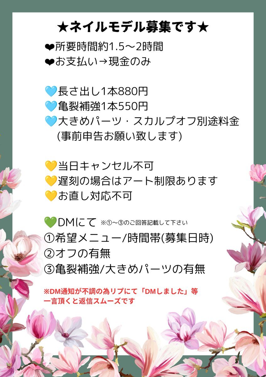 #ネイルモニター 募集 本日14日(金)12時~16時(時間相談) ☆ハンドシンプル4000円~ ☆ハンドプチワンホン4500円〜 ☆ハンドアート5000円〜 ☆フット 4500円〜 ⚠️1枚目画像参照必須 必要事項記入の上DMにて💌 #新宿 #ジェル #フット #ハンドモデル #ネイルモデル #冬ネイル #クリスマスネイル pic.x.com/L0NWnj7Ncp
