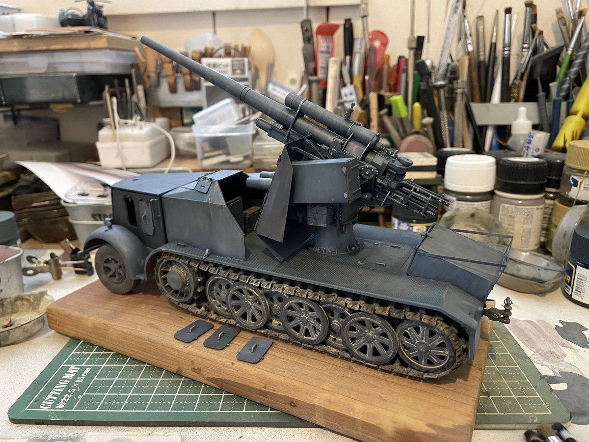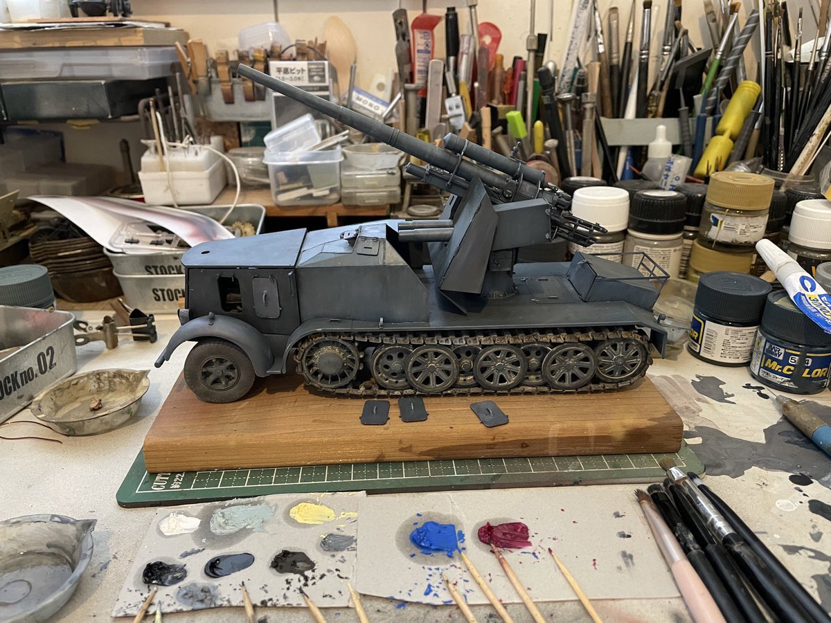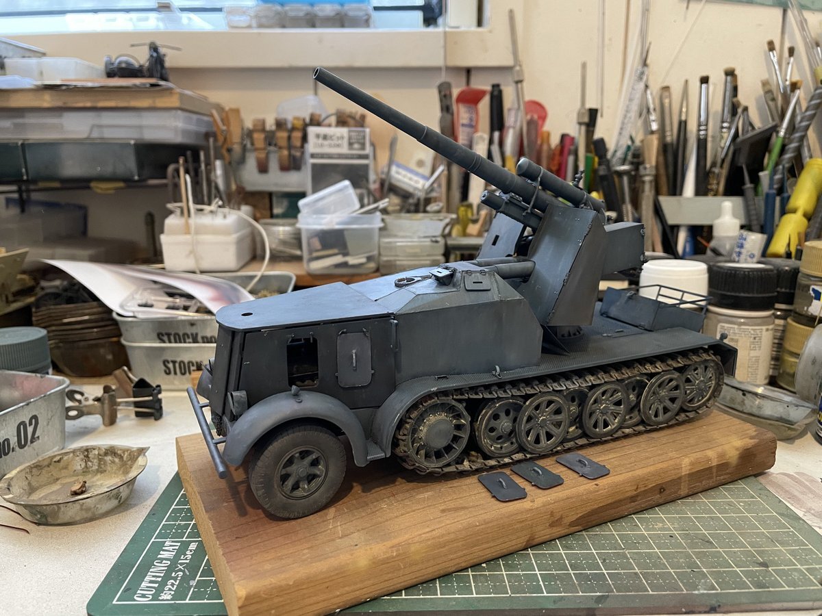 基本塗装終了後はアーマーモデリング 7月号を参考に油彩によるドッティング。 この特集のお陰で、何の色を使えば良いのか迷わなくてすむので助かります。 ドッティング終わったら乾燥させるために来週末まで放置! 来週末はやっとウェザリング工程〜。 #12tハーフトラック88mm自走砲製作 pic.x.com/rRWsJ7fTNW
