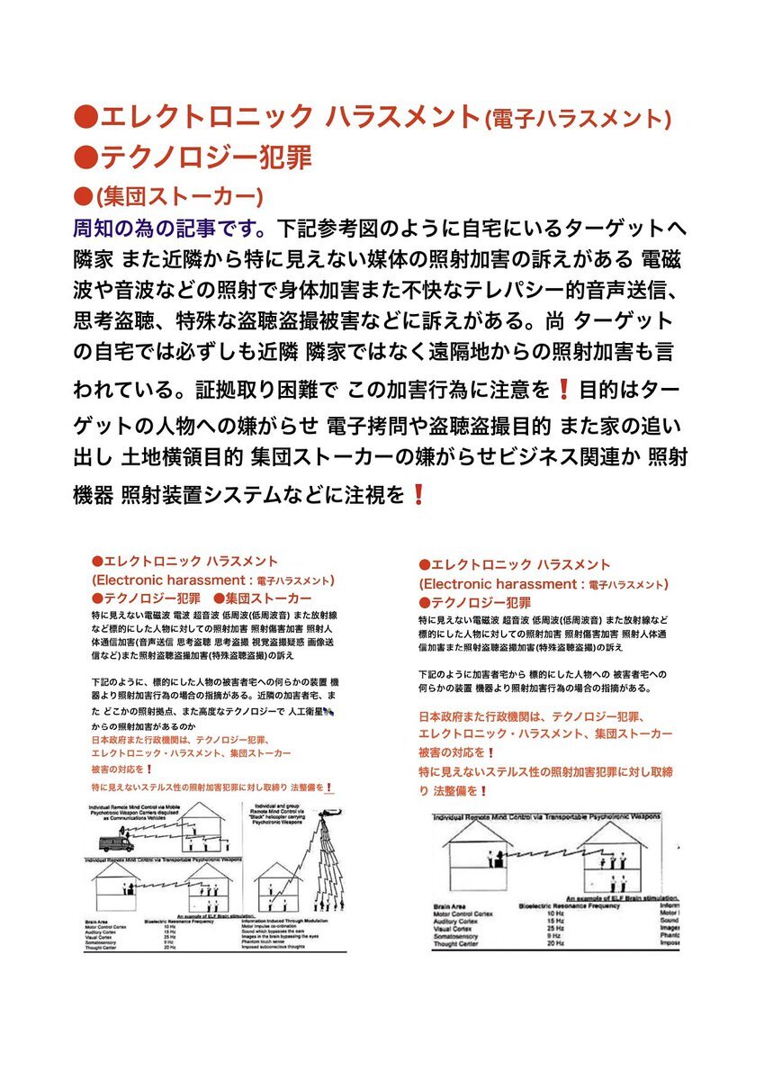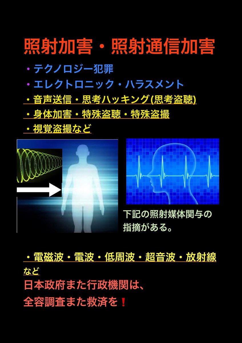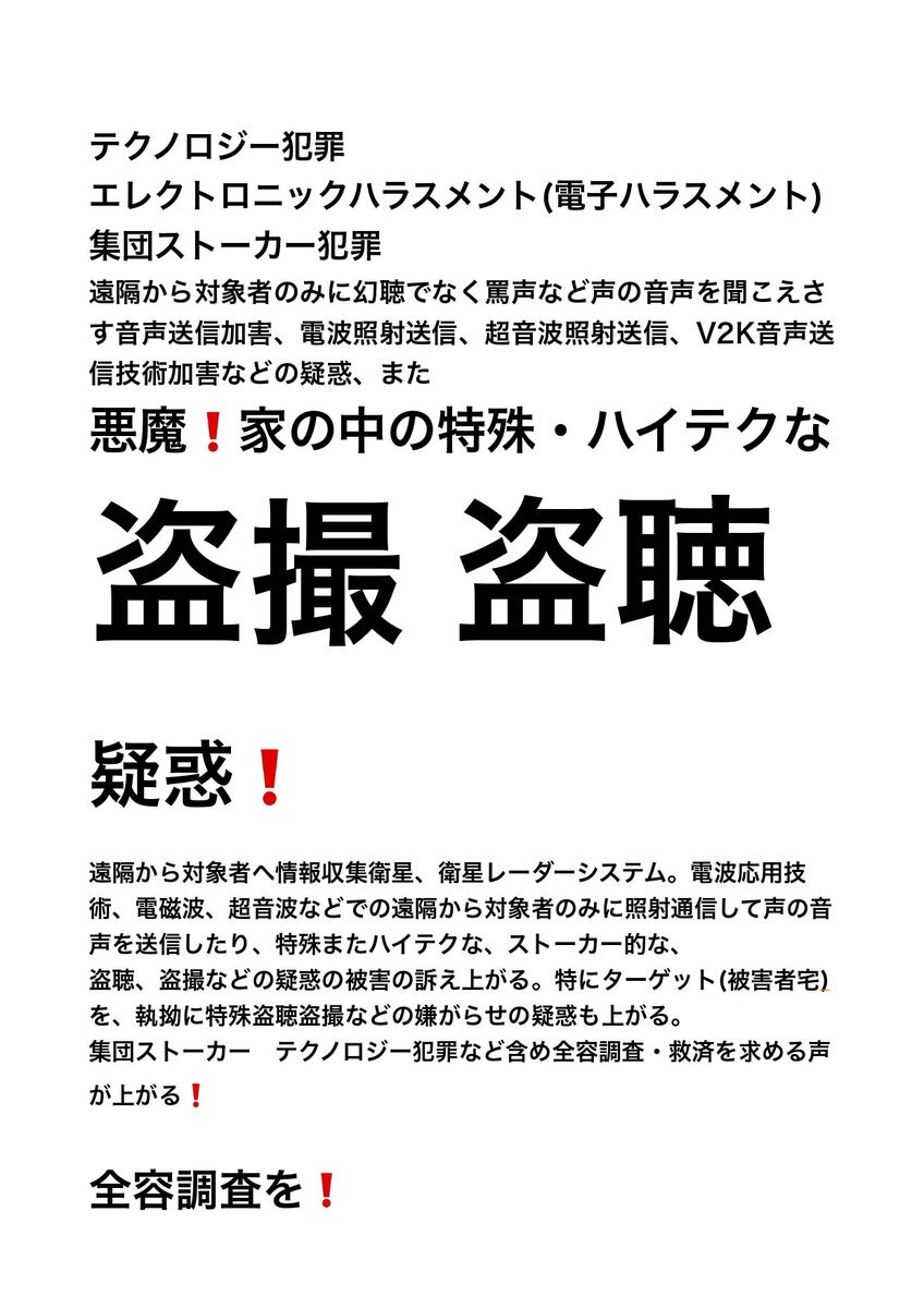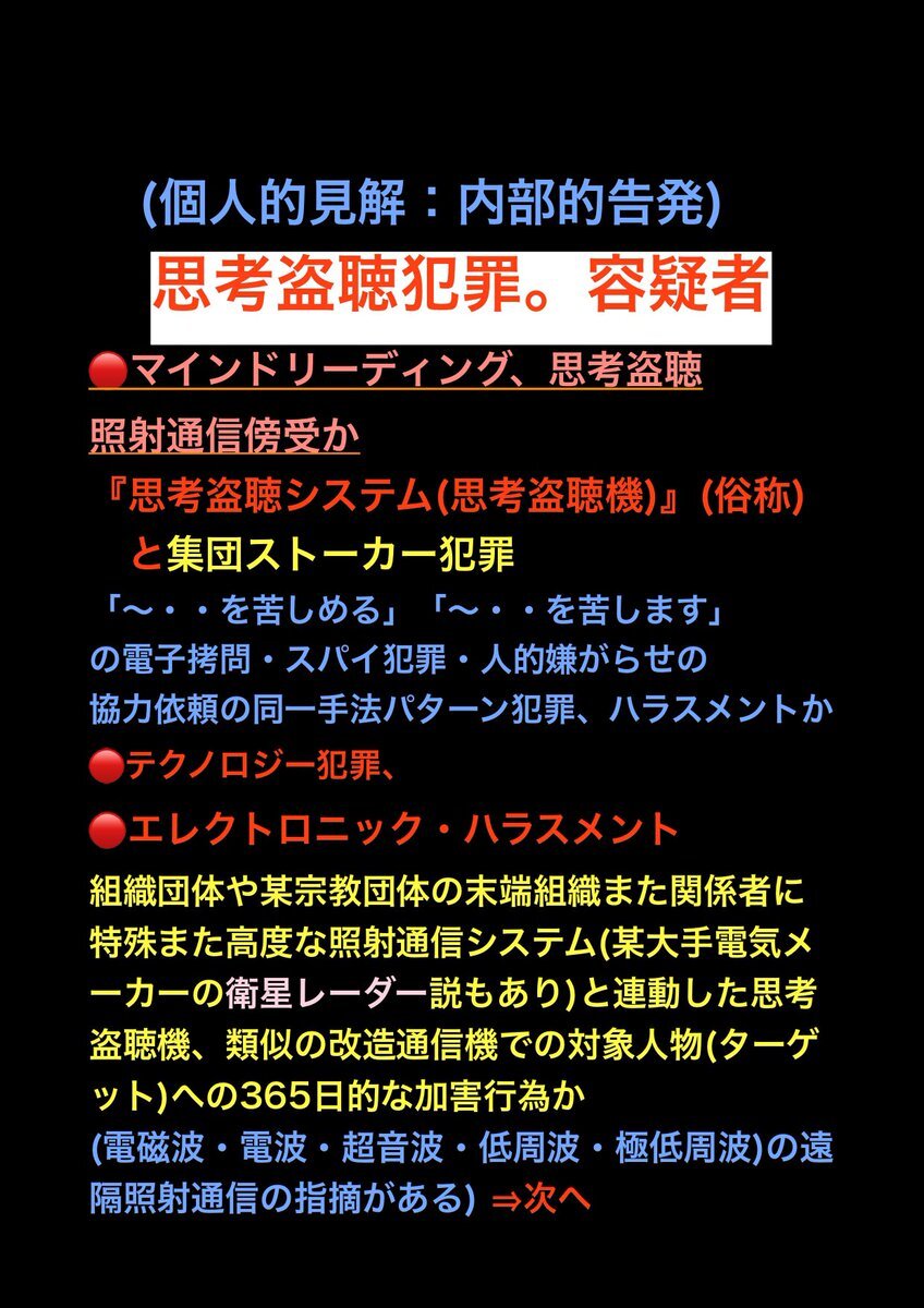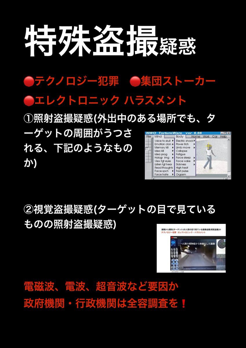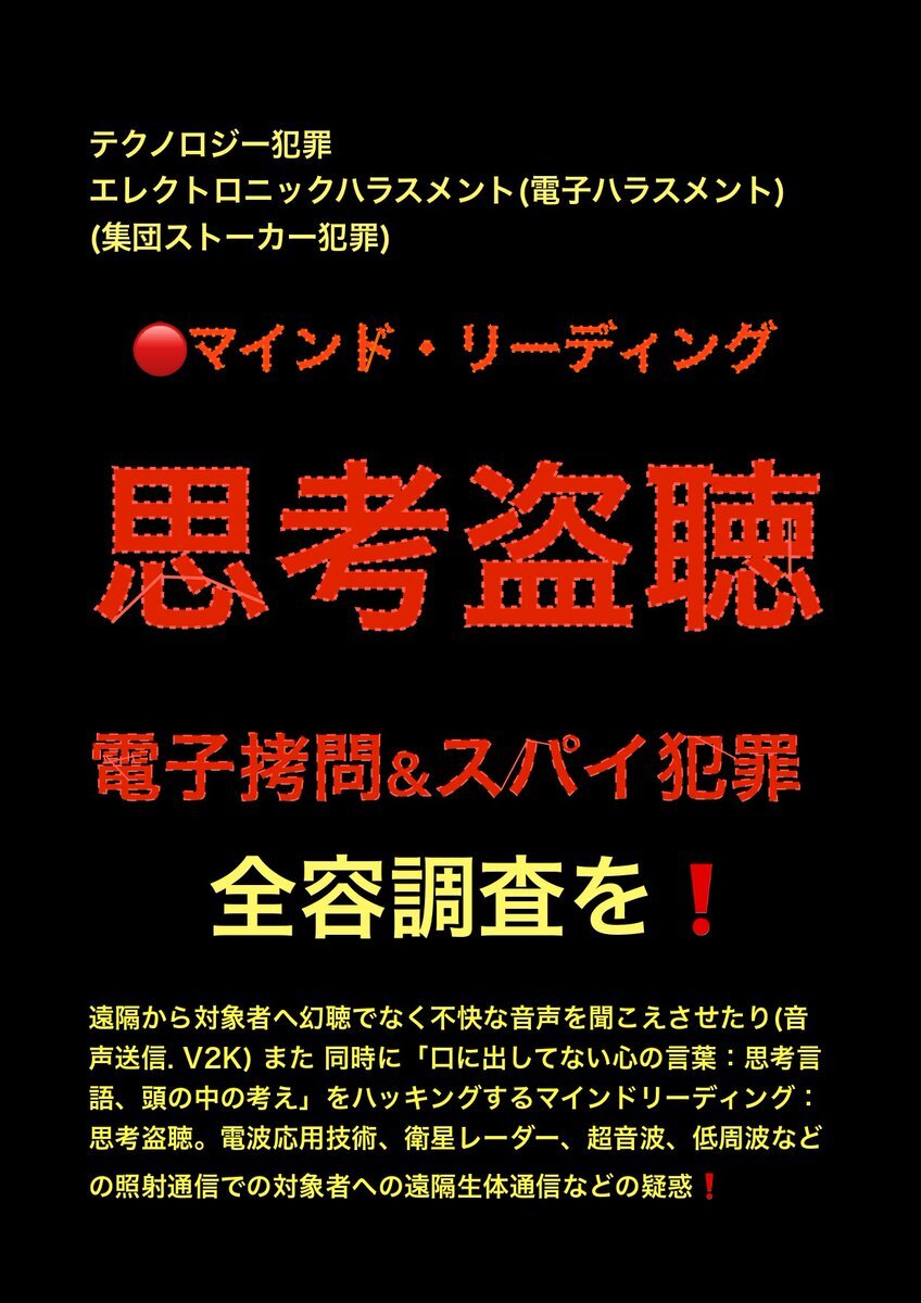 テクノロジー犯罪 エレクトロニック ハラスメント また 不可解な 集団ストーカー犯罪 の被害の訴え。その中でターゲット(被害者)への特殊な #盗聴 #盗撮 の疑惑の被害の訴え。行政機関は対応調査 解明 救済などを #人権侵害 #疑惑 #調査 #個人情報 個人情報 pic.x.com/SMotzkQP0L