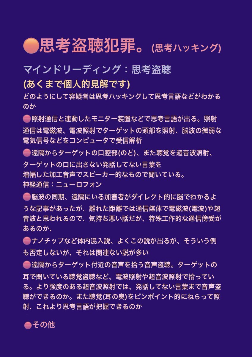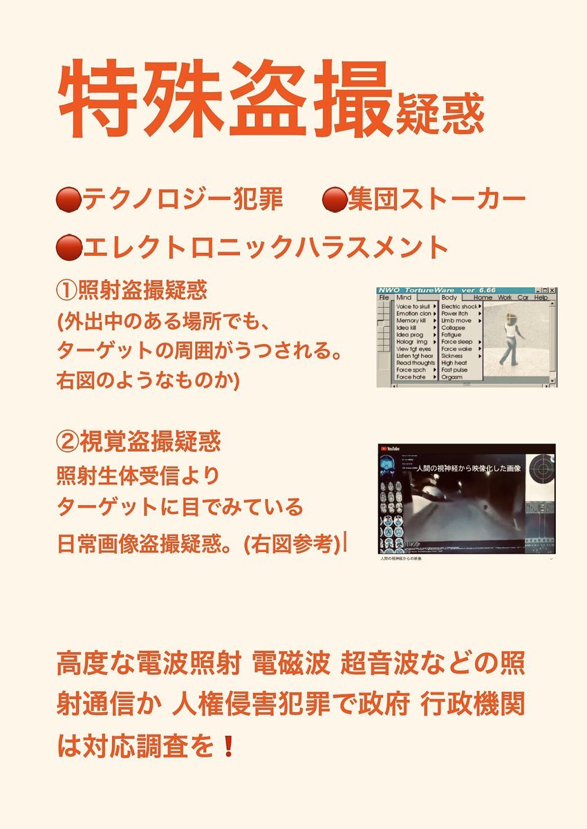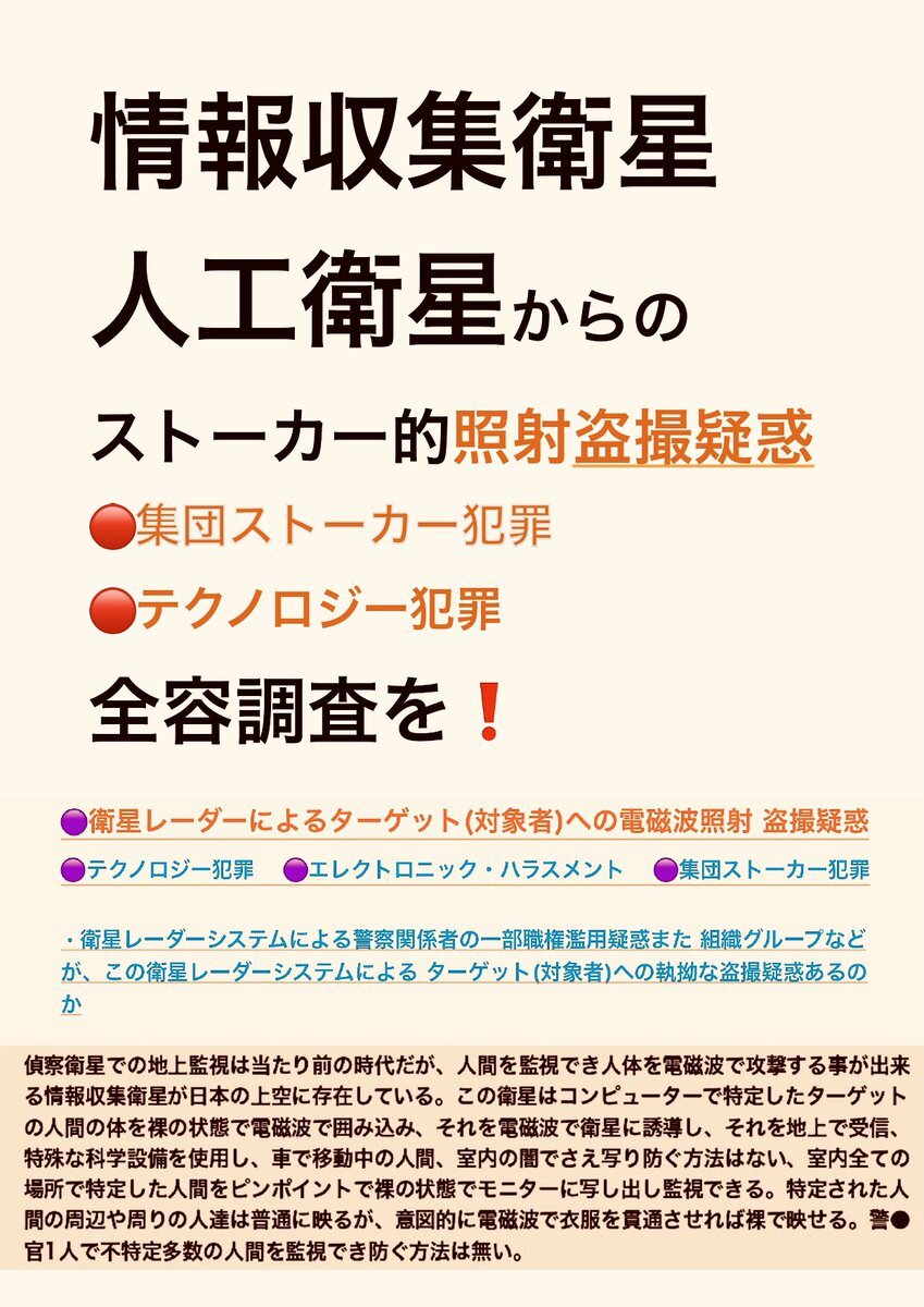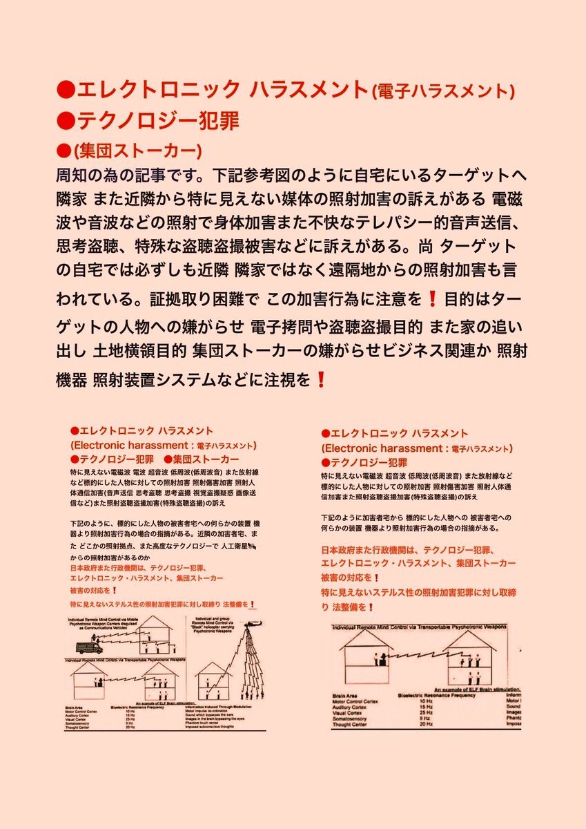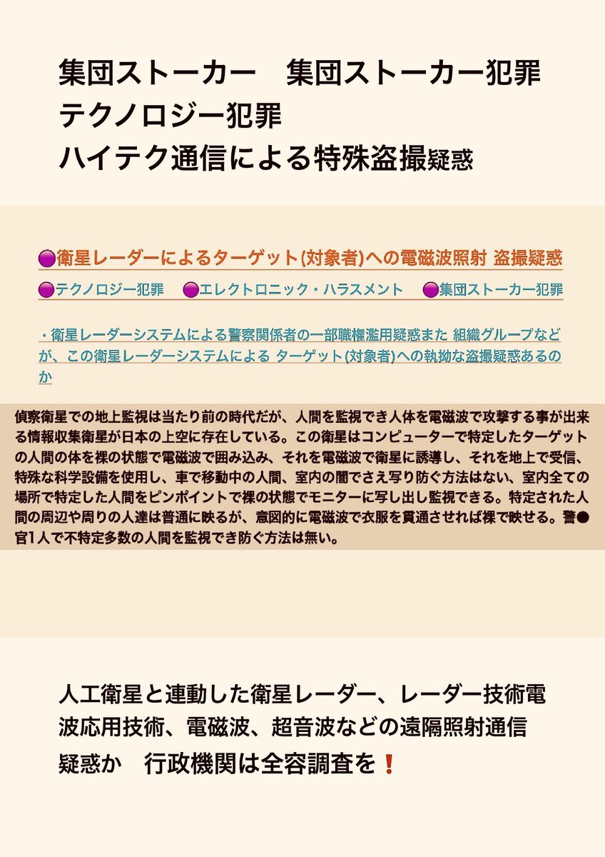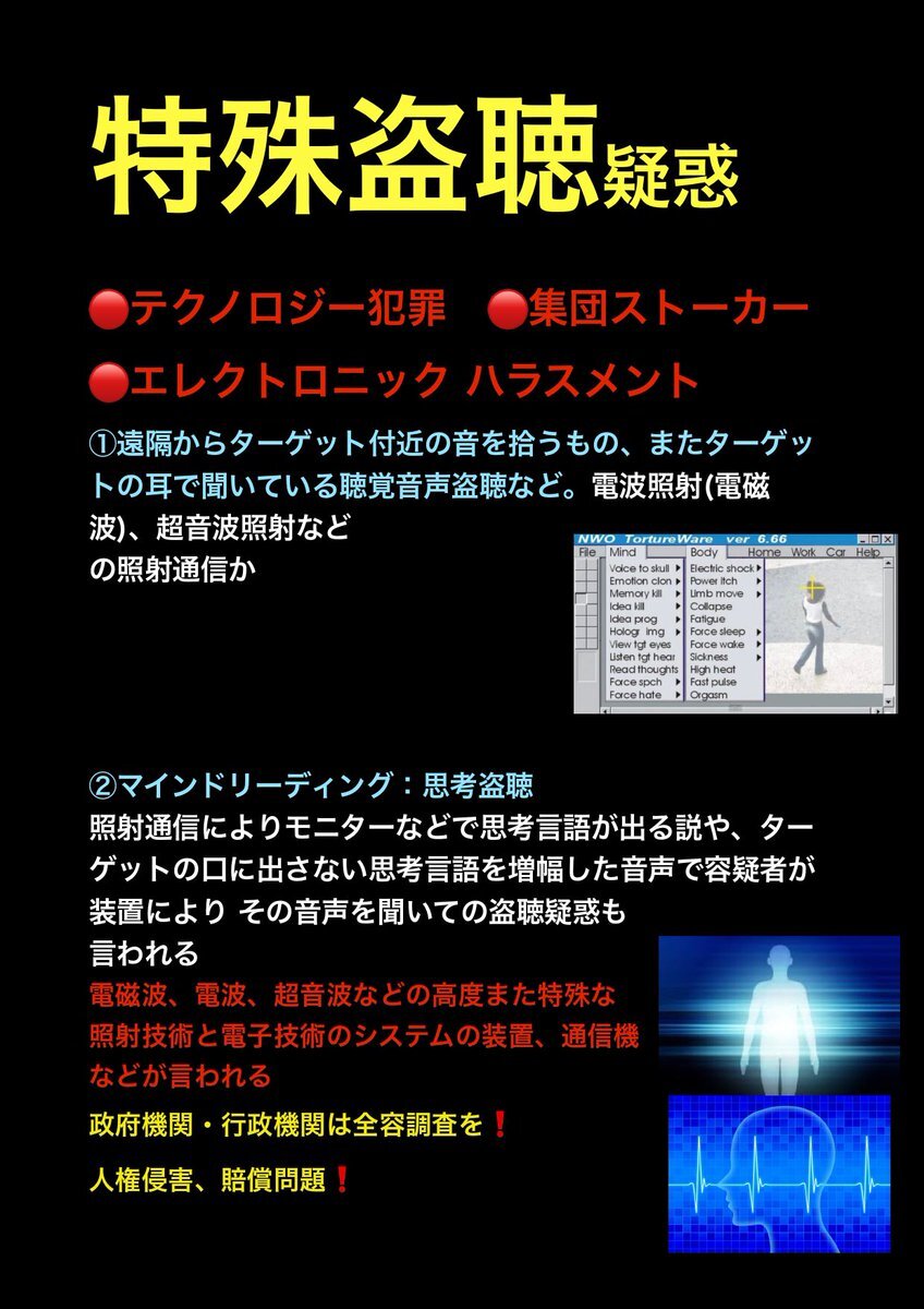 テクノロジー犯罪 エレクトロニック ハラスメント また 不可解な 集団ストーカー犯罪 の被害の訴え。その中でターゲット(被害者)への特殊な #盗聴 #盗撮 の疑惑の被害の訴え。行政機関は対応調査 解明 救済などを #人権侵害 #疑惑 #調査 #個人情報 個人情報 pic.x.com/SMotzkQP0L