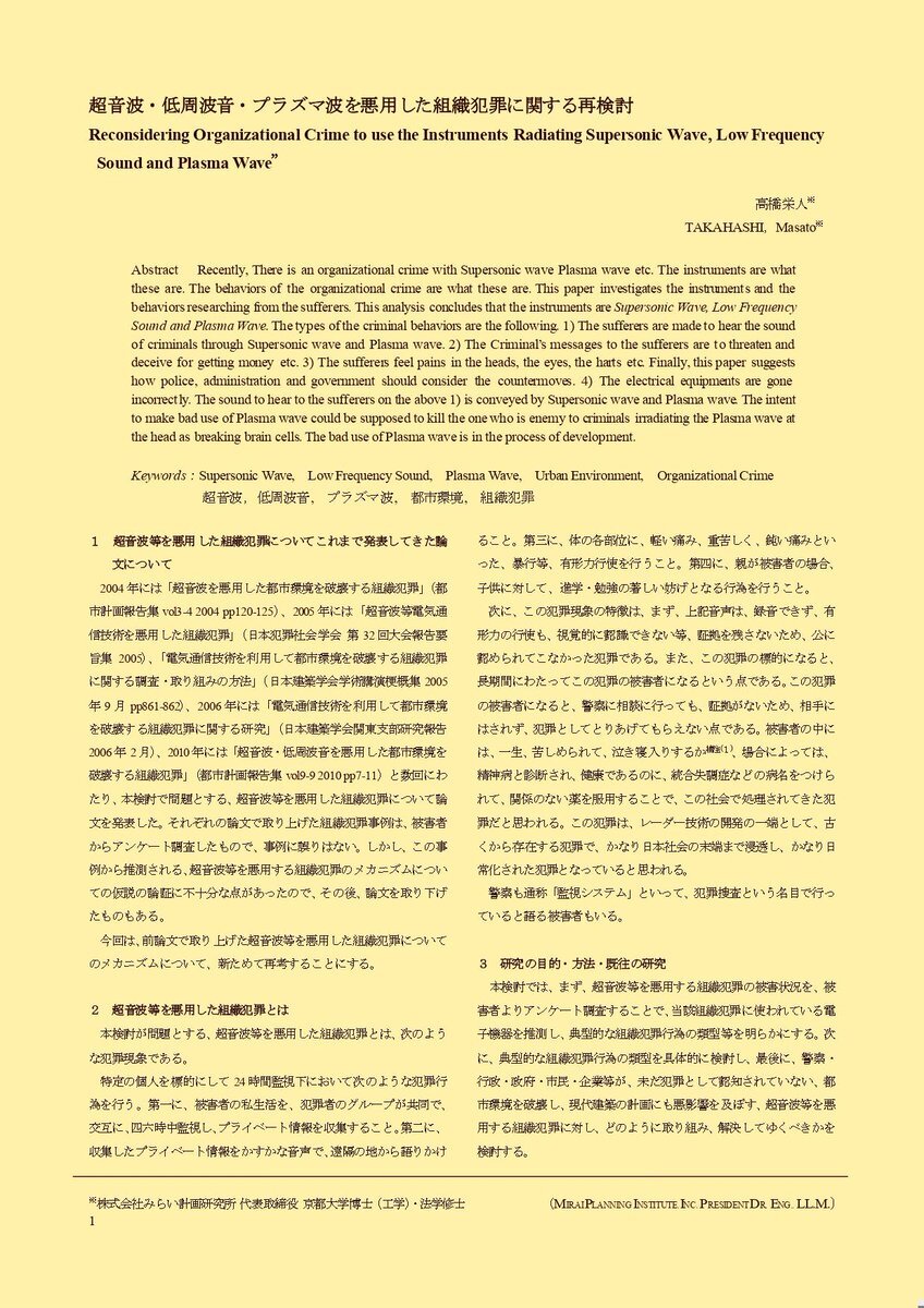 テクノロジー犯罪 エレクトロニック ハラスメント 集団ストーカー犯罪 の訴え。 その中で過去 被害者の間でもUPされた記事がある 「超音波 低周波音 プラズマ波を悪用した組織犯罪に関する再検討」の論文。 この論文は電磁波はないが いずれにせよ 行政機関は対応調査を(トレンド 非核三原則 pic.x.com/4p8LRhID18