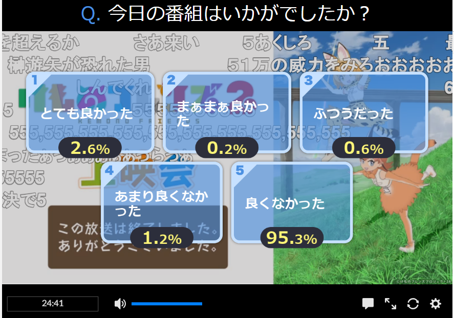 ケムリクサアイコンの還暦の方 エンタメ関連の知識に詳しいらしくて 独自の調査でけもフレファンは6%になったとかを他人に説明してたり どーじさんと同様に6年以上も、けもフレ3は売り上げが悪い的な事発信し続けてる気がする。 継続出来てるし、好きな事を発信し続けてるから、良い事だな。