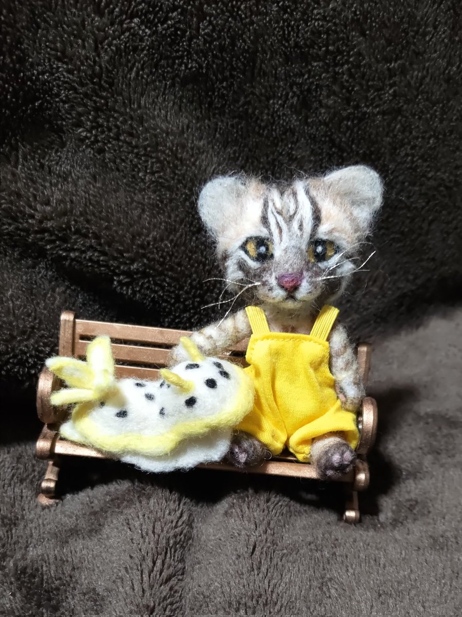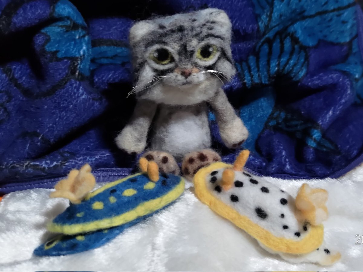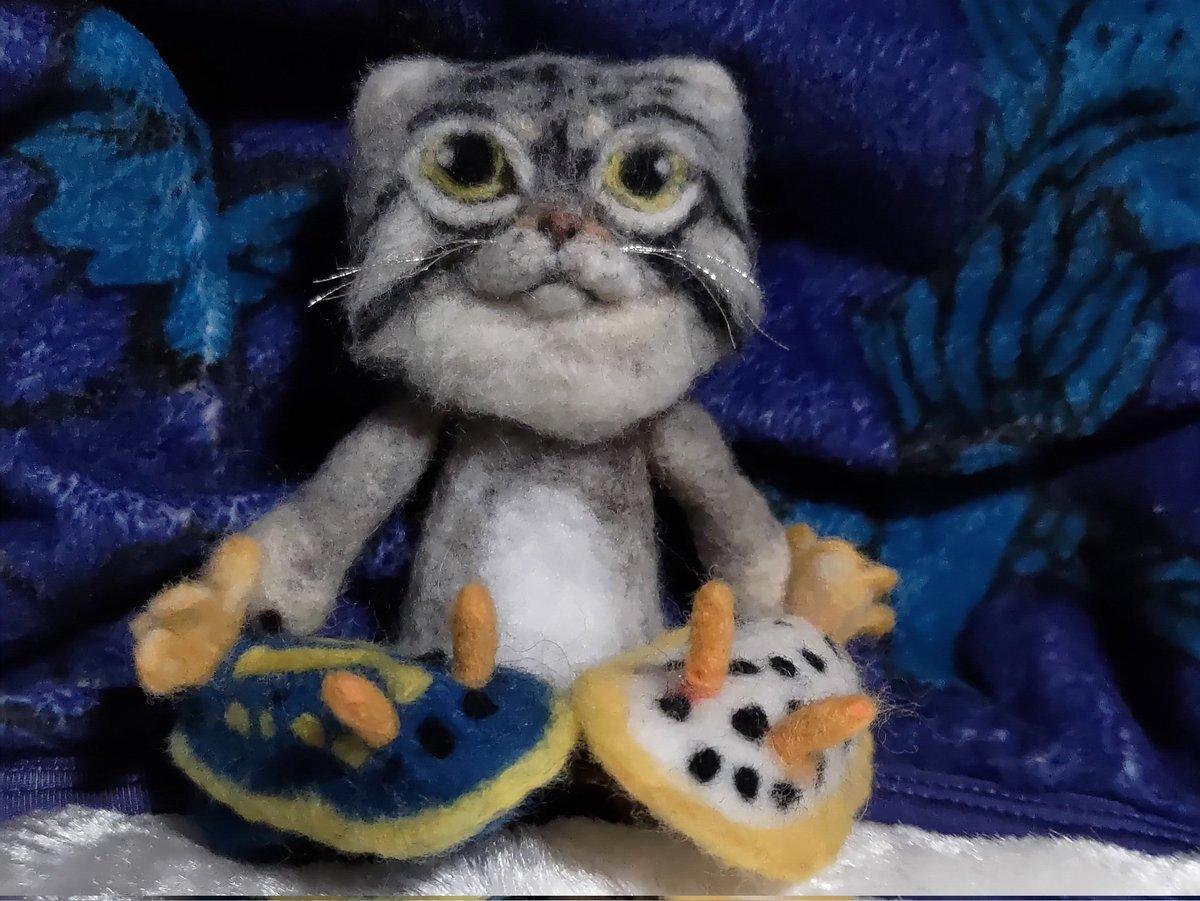 #羊毛フエルト おともマヌルネコ人形 ☆ 成長記録 おともマヌルネコ人形の尻尾が完成 実はこの子の尻尾が細かったので作り直し中 /(.. ) シロウミウシは二次鰓が出来て今日がお誕生日🎂 ※レフくんとマミちゃん飛び入り参加 #おともマヌルネコ人形 #シロウミウシ #ハンドメイド pic.x.com/PDT1BkyNWb