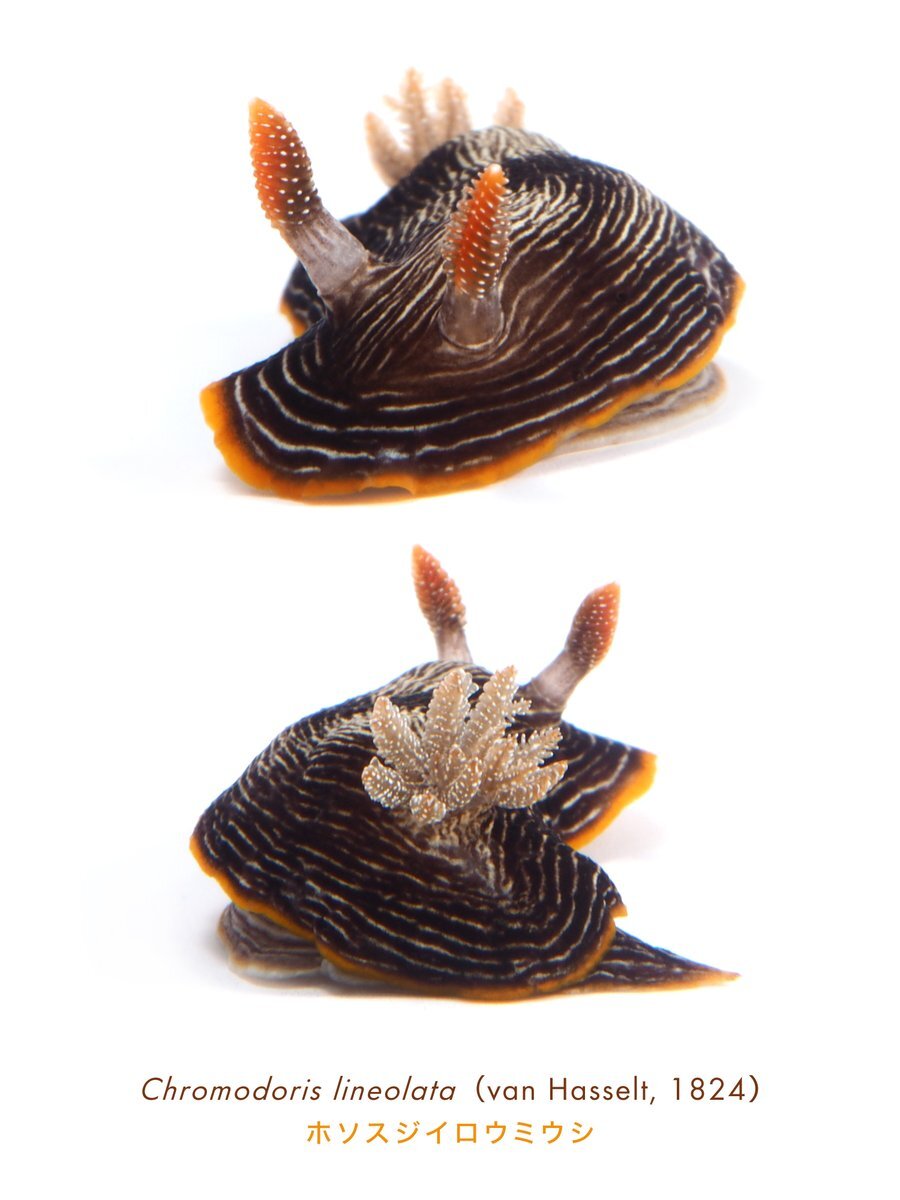 ホソスジイロウミウシ Chromodoris lineolata (van Hasselt, 1824) 奄美ではそんなに白バック撮影できてないのだけど、これはじっくり撮影してみた。 結構細かなところでアオウミウシとは形が違うもんだなぁ。伸びて2cmくらい。