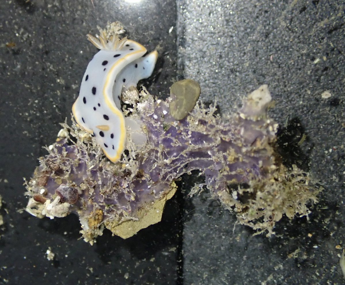 Chromodorisの仲間とか、ウミウシ的な見た目で色彩もカラフルなものが多いグループだけど、本州の浅瀬で見つかるのはシロウミウシとモンコウミウシくらいで、なかなか餌としても、この二種だけでは属の傾向が掴めていない感じがある。 x.com/inapty/status/…