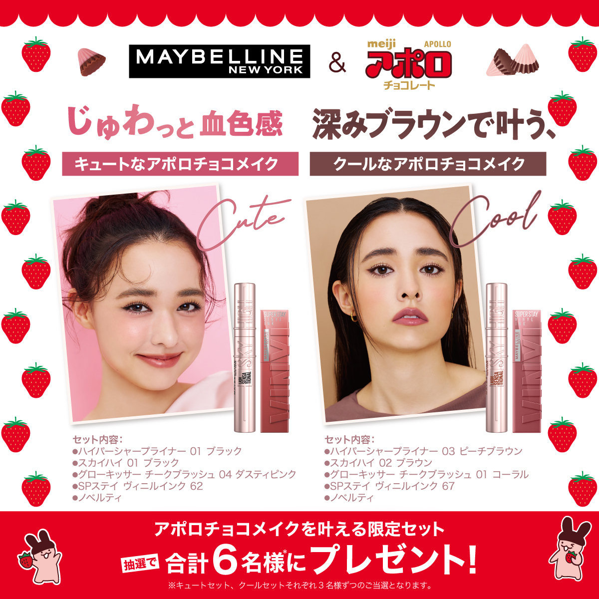 / #アポロ & #メイベリン 11/11から順次展開中! \ アポロチョコメイクを叶える、限定セットを6名様にプレゼント🍓🍫 【応募方法】 ①@LoveMaybelline をフォロー ②#メイベリン #アポロチョコメイク を付けて引用リポスト 試したいメイク(キュート/クール)の記載で確率UP✨ 11/16 23:59迄 ©meiji