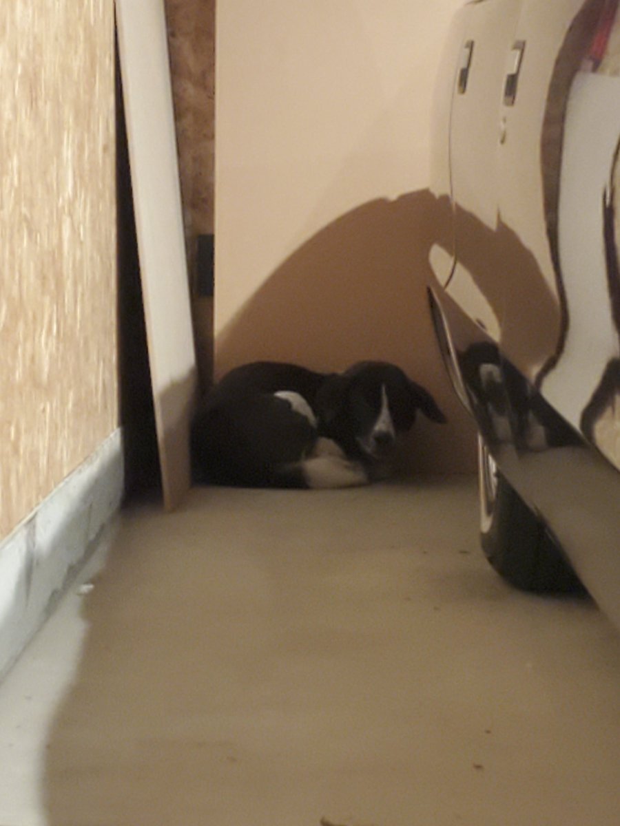 知らんイッヌがうちのガレージに居るんだけども... 誰かイッヌ迷子になってない? 日曜から開けてないからとりあえず水と餌は置いといたけど、怯えて出てこないし近づくと唸るし... #迷子犬 #迷い犬 #静岡市