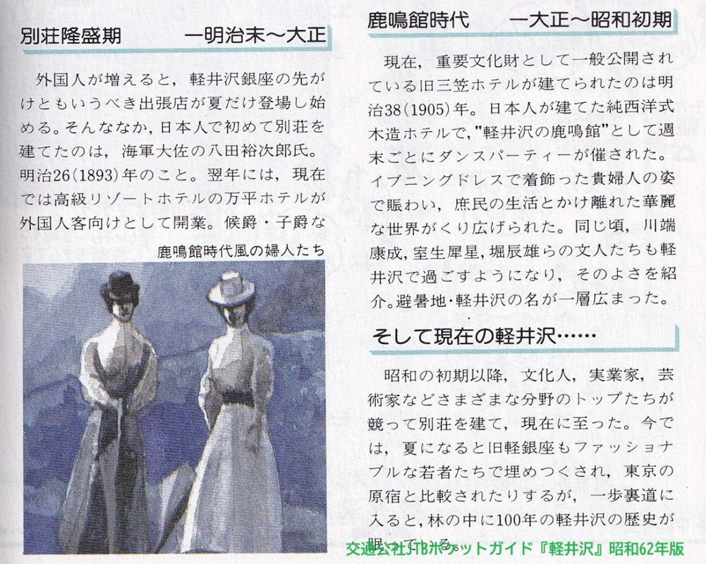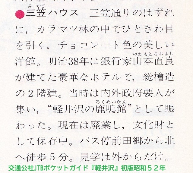 軽井沢の鹿鳴館伝説「三笠ホテルは軽井沢の鹿鳴館」 旧三笠ホテルのショップには、ドレスをレンタルし、 館内で自由に撮影ができる。若い女性や主婦の利用をみかける。 軽井沢には伝説が多いが、「三笠ホテルは軽井沢の鹿鳴館」は観光業・関連の企業や自治体等を問わず流布され、拡大を続けている。 pic.x.com/Ks85FN4lia