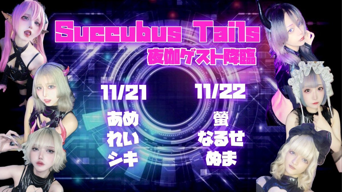 💙🩷交換留学のお知らせ🩷💙 ────────────── 11/21〜22の2日間 名古屋Succubus Tailsから6名のサキュバスちゃんが降臨‼️✨ 21日 あめ@AME_Succubus れい@rei_Succubus シキ@_SHIKI_Succubus 22日 螢@Succubus_hotaru なるせ@Succubus_narse ぬま@Numa_Succubus