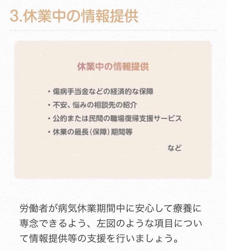 労働者が病気休業期間中に安心して療養に専念できるよう、以下のような項目について情報提供等の支援を行うことが必要です。 ・傷病手当金などの経済的な保障 ・不安、悩みの相談先の紹介 ・職場復帰支援サービス ・休業の最長(保障)期間等 など kokoro.mhlw.go.jp/return-to-work/ pic.x.com/j9m2Ef2ddD