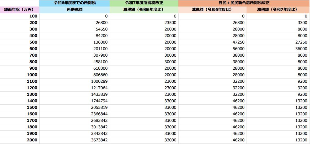 てなわけで皆様お待たせいたしました。本日発表された自民と民民の合意が実施された場合の、額面年収ごとの減税額試算表です(給与所得者前提)。要は『額面年収476-665万円の間にある人以外は、今年(令和7年)の所得税より月700円から1100円ぐらい減税されるよ、良かったね』という改正ね、これ(笑