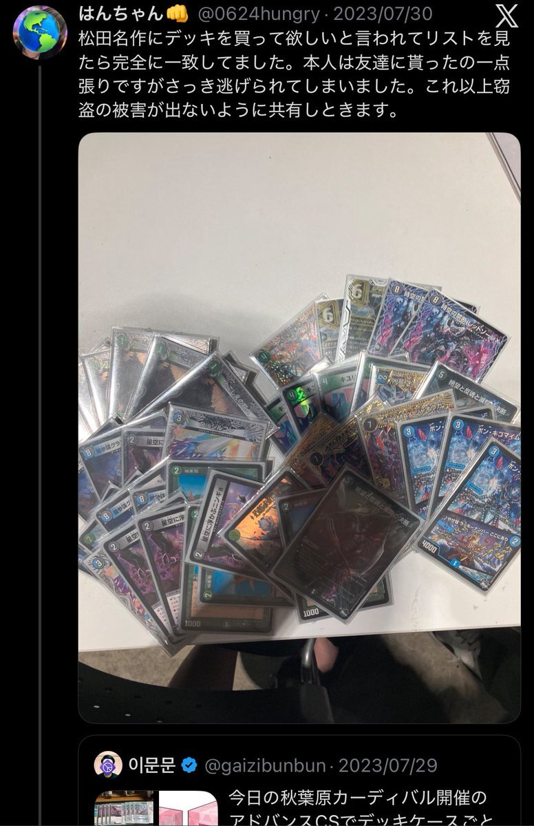【朗報】売ろうとしたデュエマのデッキが盗難品と判明しトイレのダクトから逃走(デッキは友達に貰ったと主張)、約2年後にグランプリ会場への不正入場によりDMPランキング資格の停止処分(18ヶ月)をくらっていたダクト・マスターズ 松田名作(津田偉作)さん、ワンピカードのフラッグシップ大会で優勝する pic.x.com/23wDwV2ViK x.com/ajtaltbmwgpj/s…