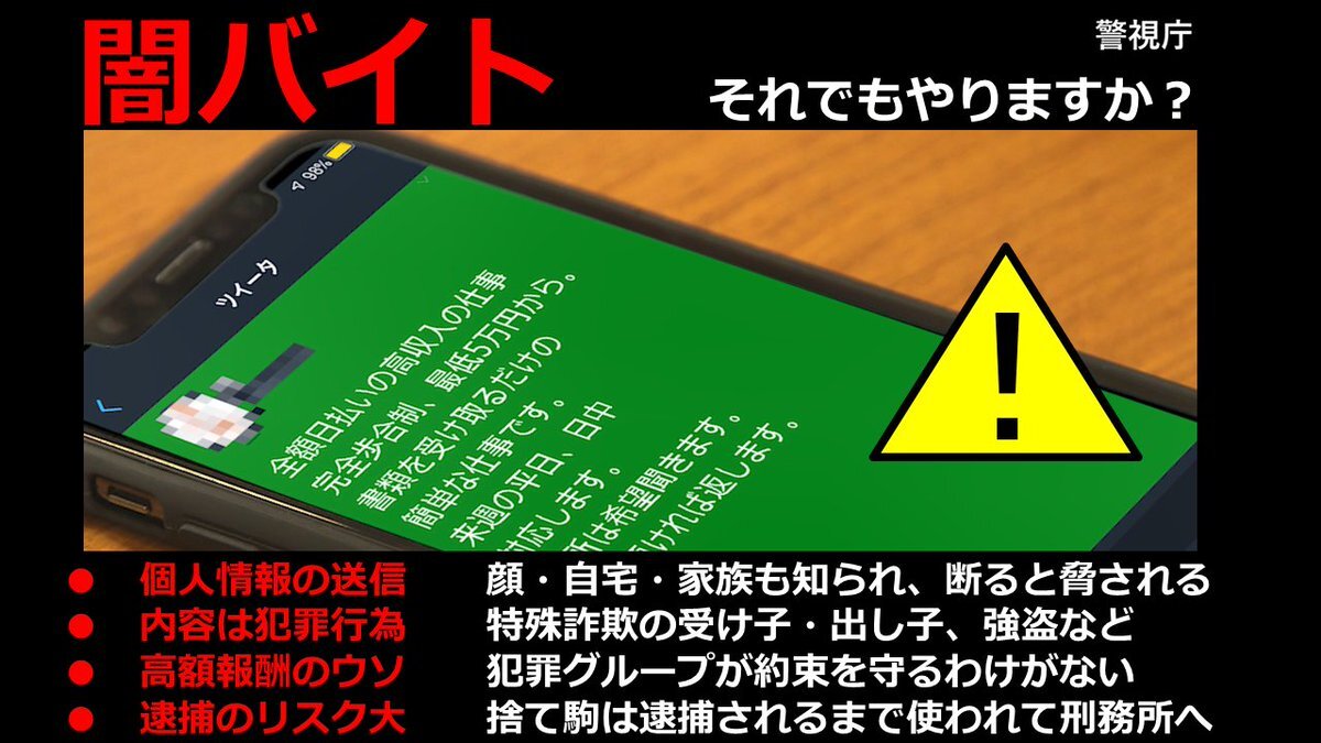 返信先:@O6lS2j3SnF9141こちらは警視庁です このポストは、詐欺等の実行犯を募集する不適切な書き込みのおそれがあります 闇バイト 闇仕事 裏バイト 裏仕事 運び 受け 出し 叩き 荷受け UD #闇バイト #闇仕事 #裏バイト #裏仕事 #運び #受け #出し #叩き #荷受け #UD #BAN闇バイト pic.x.com/ONS5D9RWKW