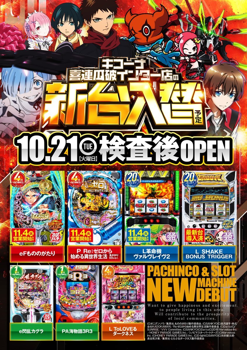┏━━━━━━━━━━┓ ┃ 新台入替 ┃ ┗━━━━━━━━━━┛ キコーナ喜連瓜破インター店です🌙 明日10月21日(火)は新台入替🎉 オープンは検査後となりますのでご了承ください😌 皆さまのご来店 心よりお待ちしております😇 #つぶやキコーナ #新台入替 pic.x.com/xHH61Ys66B