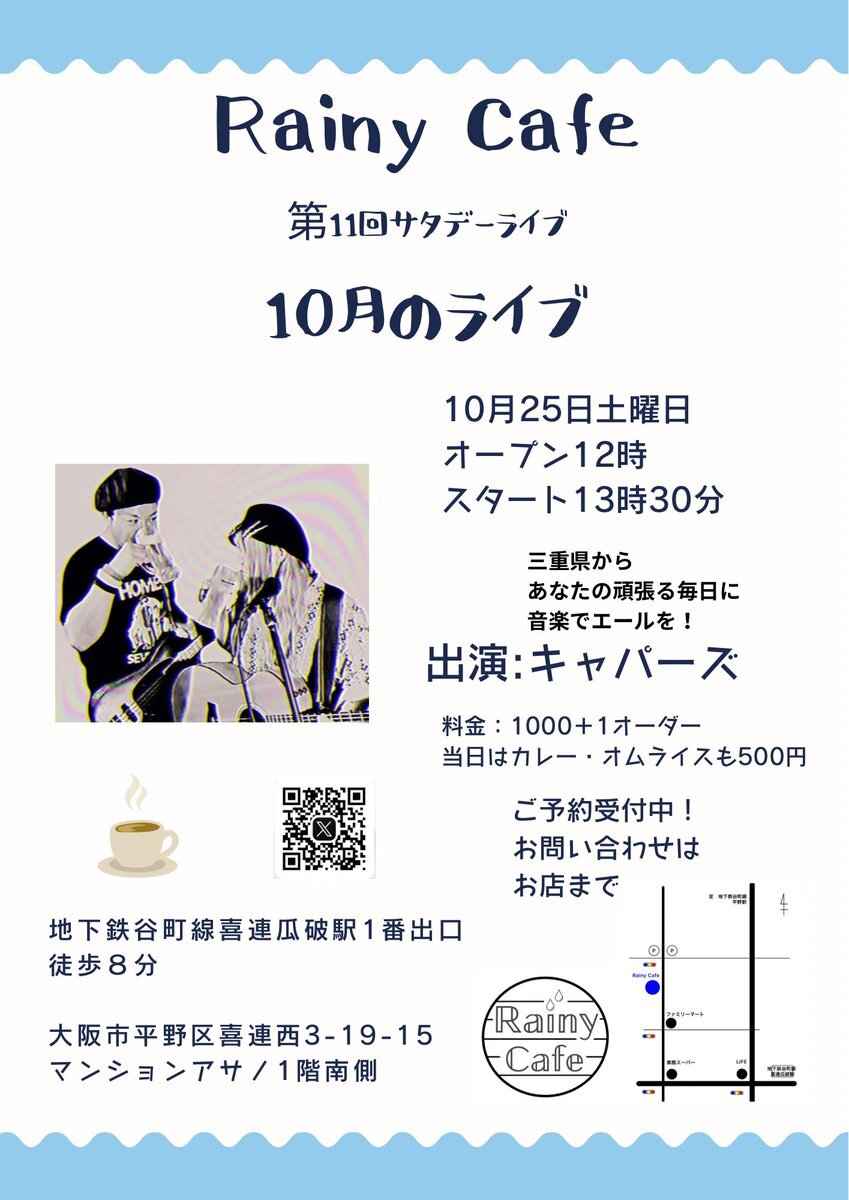 【次回のキャパーズ🐚】 10/25(土) 喜連瓜破 Rainy Cafe 『第11回サタデーライブ』 charge: ¥1,000+1オーダー 初めましての場所!きれうりわり!お昼のライブ、キャパーズがっつりさせていただきます!!この日はカレーやオムライスが¥500で🍴😳!? ご予約よろしくお願いいたします🙇 pic.x.com/WG8DNpIkBU