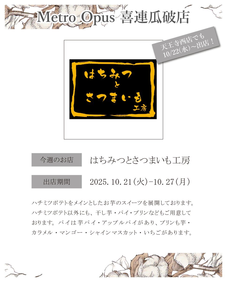 📢Metro Opus 喜連瓜破店は 2025.10.21(火)-10.27(月)まで 『はちみつとさつまいも工房』が出店! #ご褒美スイーツ #さつまいも #さつまいもスイーツ #Metroスイーツ #OsakaMetro #駅直結 #期間限定 #期間限定スイーツ #週替わり #週替わりスイーツ #大阪土産 #駅ナカお土産 #大阪メトロ #はちみつ pic.x.com/ZCd5WJUwuh