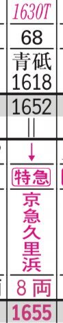 京急ダイヤ改正で平日15時台に浦賀発堀ノ内行き設定の話。 現行、日中の浦賀は4〜5分で即折り返し。改正後は下り浦賀着が1分繰り下がり、折返しが1〜2分繰り上がる。そのため即折返しができず1運用増。16時以降は即折返しに戻る。そのタイミングで1運用減らすために堀ノ内止誕生。多分こんな感じ?