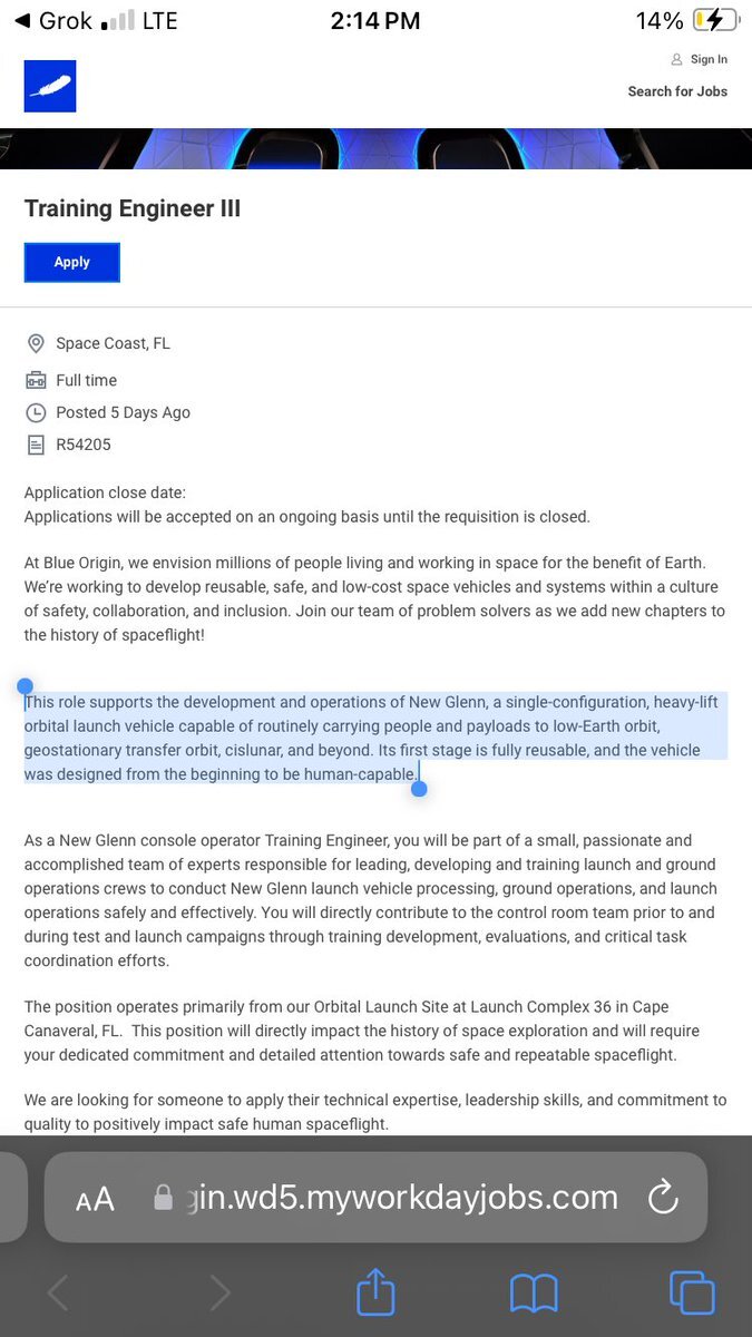 Blue Origin’s job openings for New Glenn emphasize that it’s designed to be “capable of routinely carrying people and payloads to LEO, GTO, cislunar, & beyond. …was designed from the beginning to be human-capable.” Blue Origin is clearly planning something. x.com/robotbeat/stat…