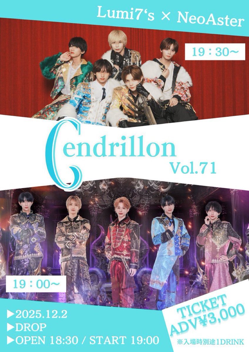 以下のライブのチケ発が本日です✨ 💫12/1(月) Cendrillon-vol.70- 📍江坂MUSE 👔特攻服 【発売】22:00~ 💫 12/2(火) Cendrillon-vol.71- 📍DROP 👔宇宙飛行記念日 【発売】22:10~ 💫 12/4(木) Cendrillon-vol.72- 📍RUIDO 👔旧王子 【発売】22:20~ URL▶️@Cinderella_ent_ pic.x.com/EdcOIShSEB