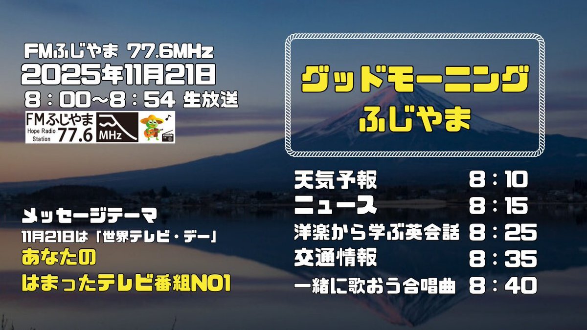 📍#FMふじやま 「#グッドモーニングふじやま」 ⏰11月21日8時から8時55分まで 生放送 👤担当:熊坂良介 ✉メッセージテーマ:宇宙、行ってみたい? 📪メッセージはこちらから fujiyama776.jp/request 📻サイマル放送はこちらから jcbasimul.com/fmfujiyama pic.x.com/ffG1EmYgoz