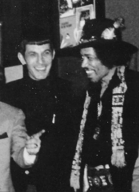 Jimi Hendrix and Leonard Nimoy (Spock from Star Trek) The photo was taken on March 25, 1968, in Cleveland, Ohio. Nimoy was in town to promote his album, The New World of Leonard Nimoy, while Hendrix was there for a concert. The two met at a nightclub called Otto's Grotto in the
