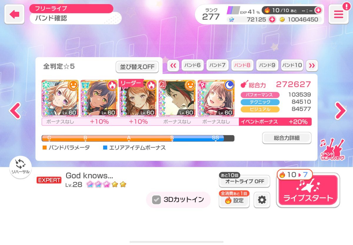5枚全部がスキルMax7.5秒BAD以上PERFECTの星5判定大艦隊。 これでも27以上全く駄目で初日から2年休んだとは言え8年半やってもFC取れないとか、私扇子もといセンスないorz 回復もつよつよ星4艦隊で、こっちも大助かり 双方完全無料で達成。 pic.x.com/h75BIapteI