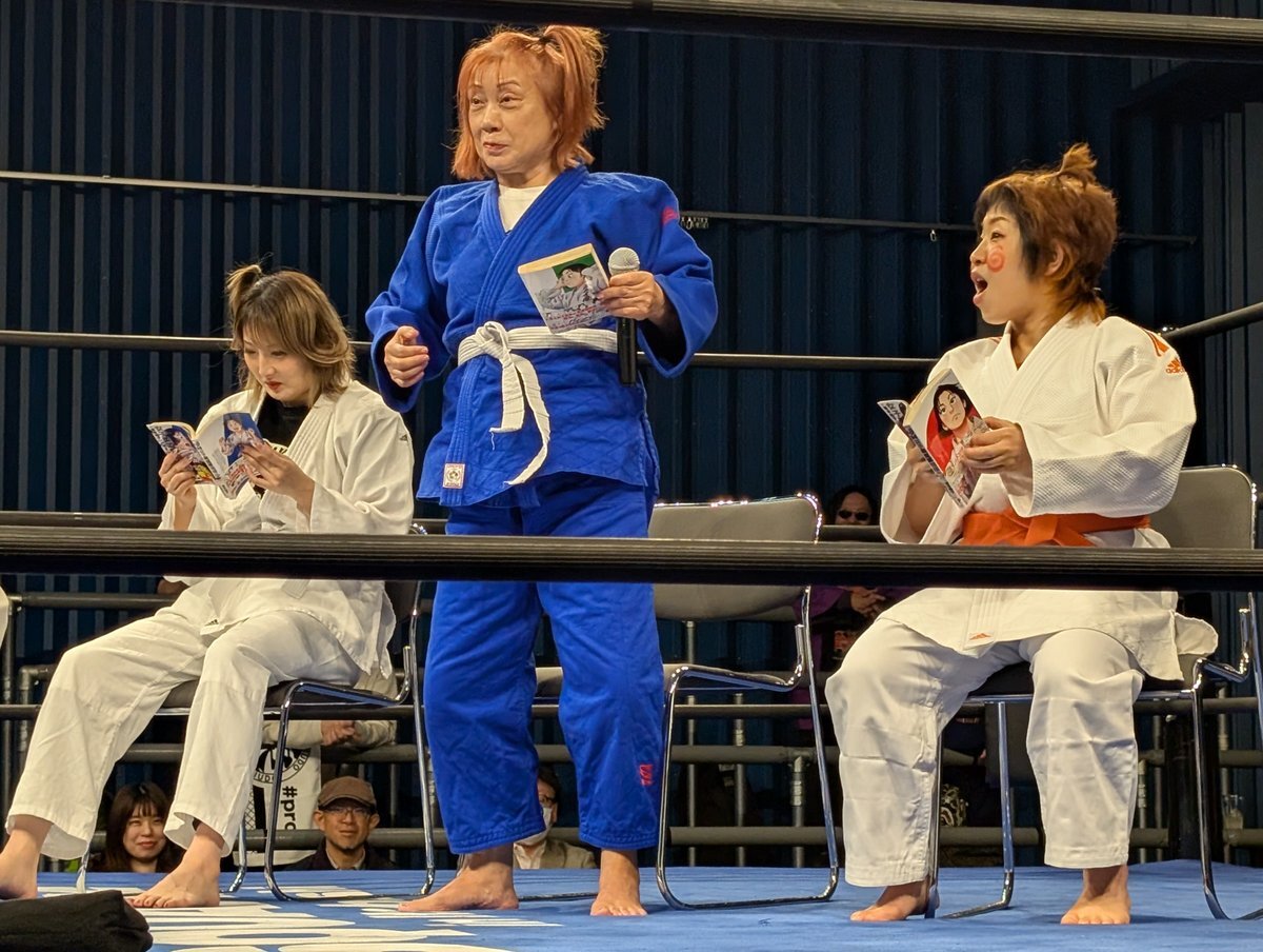 柔道の教科書としてミさんが持ってきたのは… 小林まこと氏の漫画「女子柔道部物語」 漫画内の台詞を音読する生徒3人 柔道を取り扱った漫画は結構多く、「柔道部物語」「帯をギュッとね!」「YAWARA!」あたりはよく読んでたなと… #pro_j #ゴキゲンプロレス pic.x.com/UWEylEs7Nk