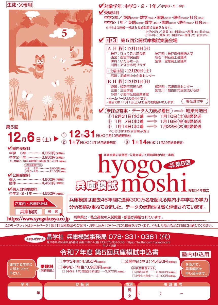 第5回公開兵庫模試 [土曜日程12月20日] 尼崎:「尼崎市中小企業センター」 [B日程12月21日] 姫路:「姫路市市民会館」 姫路西:「広畑市民センター」 三田:「三田学園」 加古川:「加古川市民交流ひろば」 小野:「小野市伝統産業会館」 で実施 pic.x.com/I1NbfFI03s