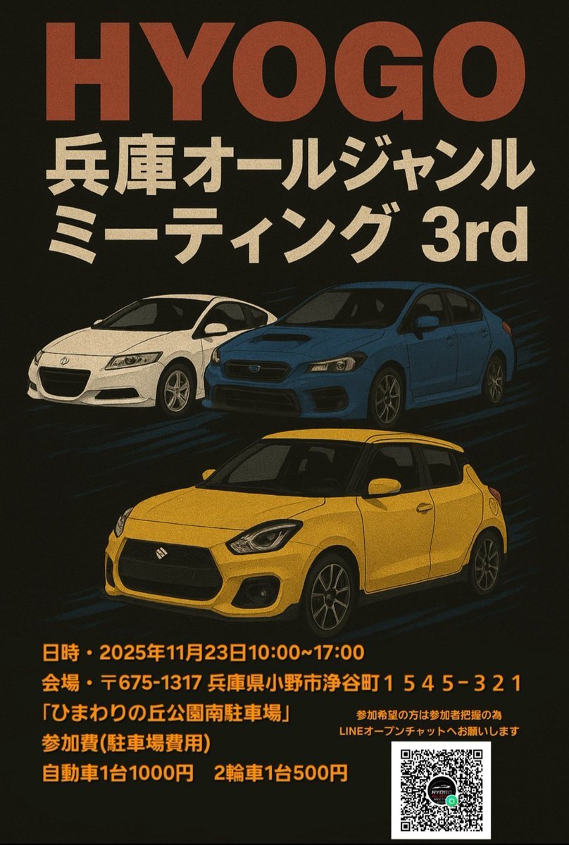 11月23日 (今週の日曜日) 兵庫県小野市の「ひまわりの丘公園南駐車場」にて開催です! まだまだ募集していますのでぜひご参加ください 参加希望の方はLINEオープンチャットもしくは私までご連絡ください よろしくお願いします #オフ会 #拡散希望 #拡散希望RP pic.x.com/88EeoWFTRk