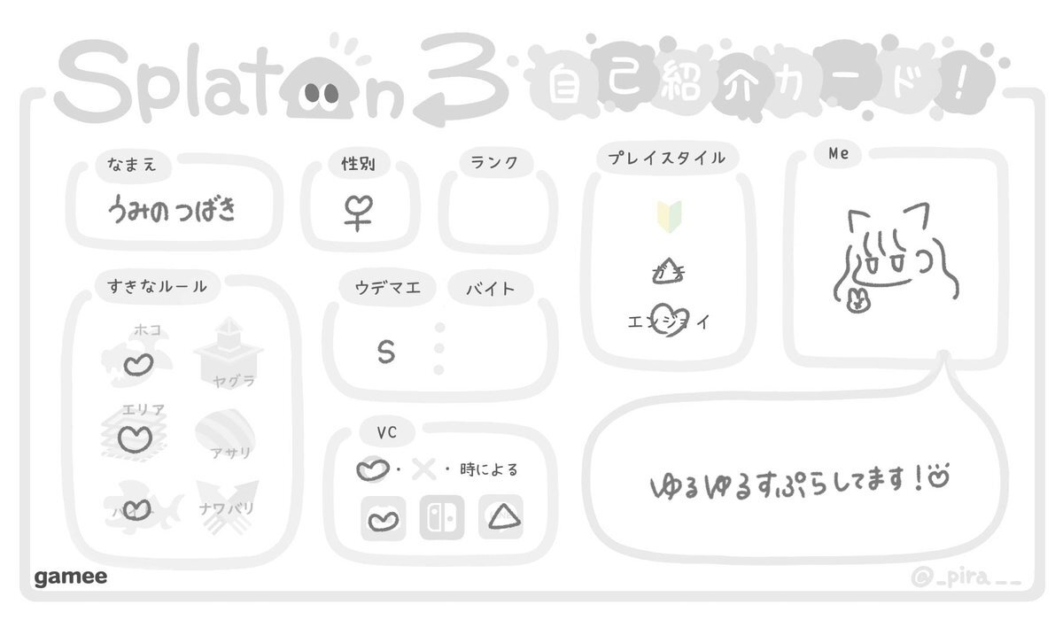 元ツイに反応良かったらお願いします!🫶🏻💭 固定ツイートに自鯖についてもあるので良かったら覗いてってください🎀 少人数や対面で遊びたい人向けの工夫も取り入れていきたいと考えてます🤍 #スプラトゥーン3自己紹介カード #スプラトゥーン3フレンド募集 #スプラトゥーン3してる人と繋がりたい x.com/mer_az22/statu…