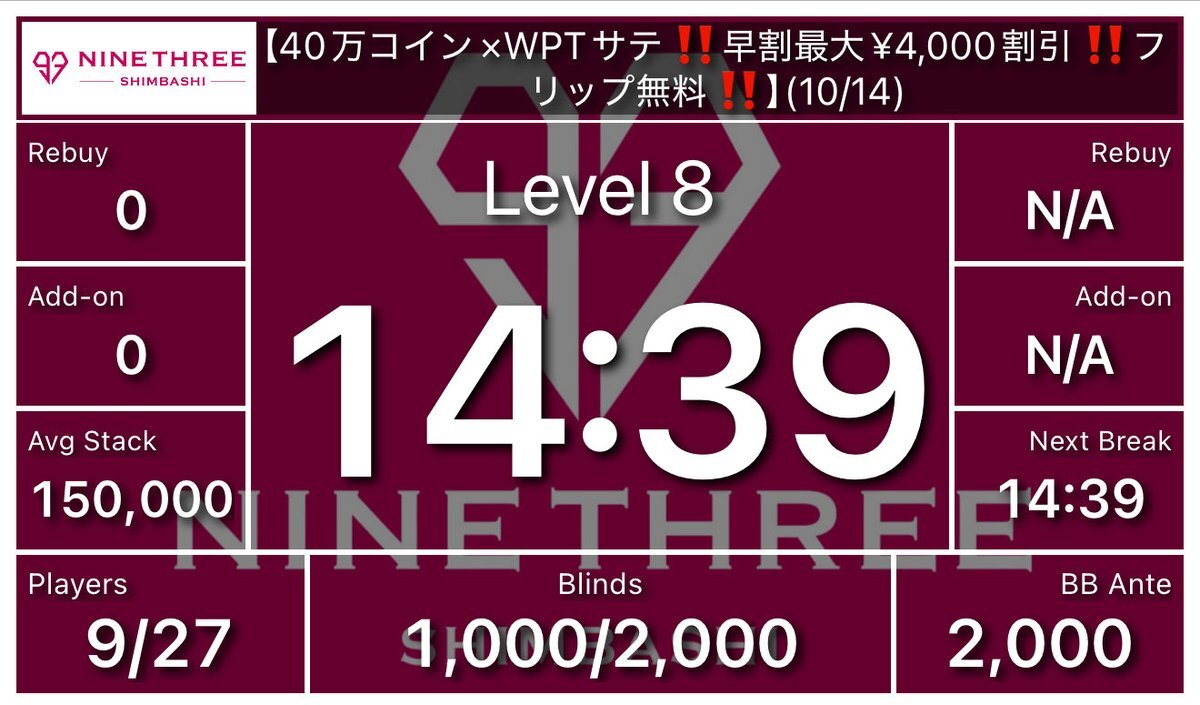 ✅2部トーナメント 【40万コイン×WPT‼️早割最大¥4,000割引‼️フリップ無料‼️】 6名様でスタート致しました‼️ 夜の新橋は狙い目です👀 前回の参加者15名様でした💦 お得な早割は23:30まで🉐 ⭐️ 10,000コイン=WPTチケット1枚に変換可能(最大6枠まで) ⭐️良ストラクチャー x.com/shimbashi_93/s…