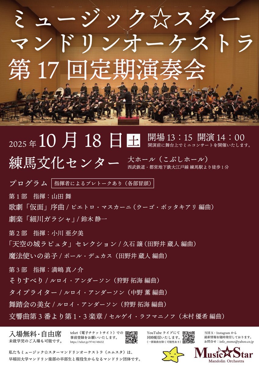 【エムスタ第17回定期演奏会のお知らせ】 📅日時:2025年10月18日(土) 🕑開場 13:15 / 開演 14:00 🏛会場:練馬文化センター 大ホール 💰入場無料 🎶開演前にミニコンサートも実施します。 👶お子様連れ専用席あり 未就学児可 🔗teketでの事前登録をお願いします:teket.jp/9741/48632 続く