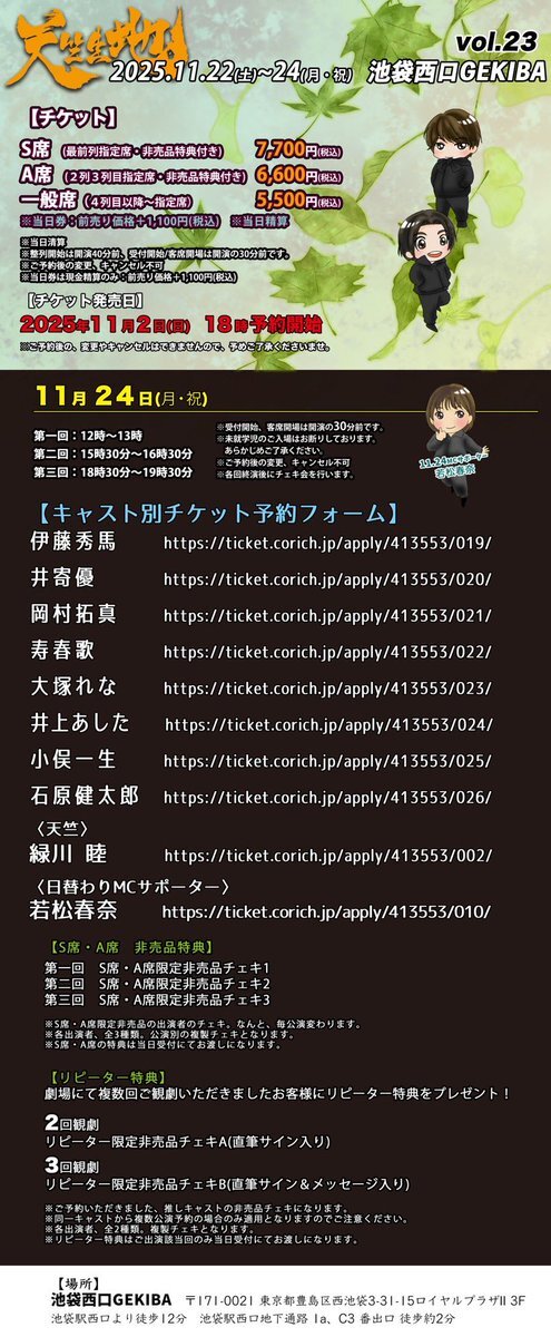 【2】 ☪️11月24日(月・祝)  出演キャスト予約フォーム 🔴伊藤秀馬 ticket.corich.jp/apply/413553/0… 🌸井寄優 ticket.corich.jp/apply/413553/0… 🩶岡村拓真 ticket.corich.jp/apply/413553/0… 🟠寿春歌 ticket.corich.jp/apply/413553/0… 🍋‍🟩大塚れな ticket.corich.jp/apply/413553/0… 🟡井上あした ticket.corich.jp/apply/413553/0… #天竺生地 pic.x.com/5pcC6reJ7Q