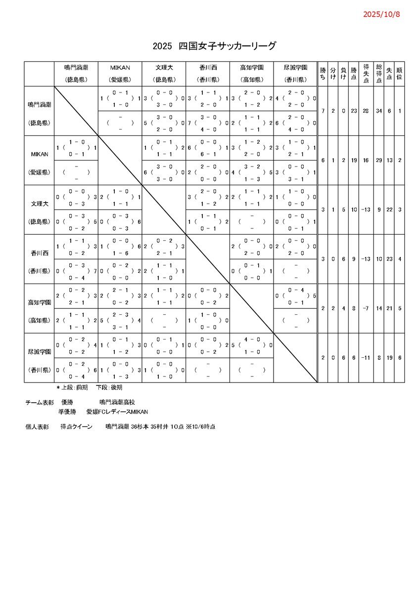 #2025四国女子サッカーリーグ #2025年度四国大会 2025/10/5 #第9節 四国学院大学香川西高校 0-7【0-3,0-4】鳴門渦潮高校 愛媛FCレディースMIKAN 6-0【3-0,3-0】徳島文理大学女子サッカー部 pic.x.com/3lCSndLSBN