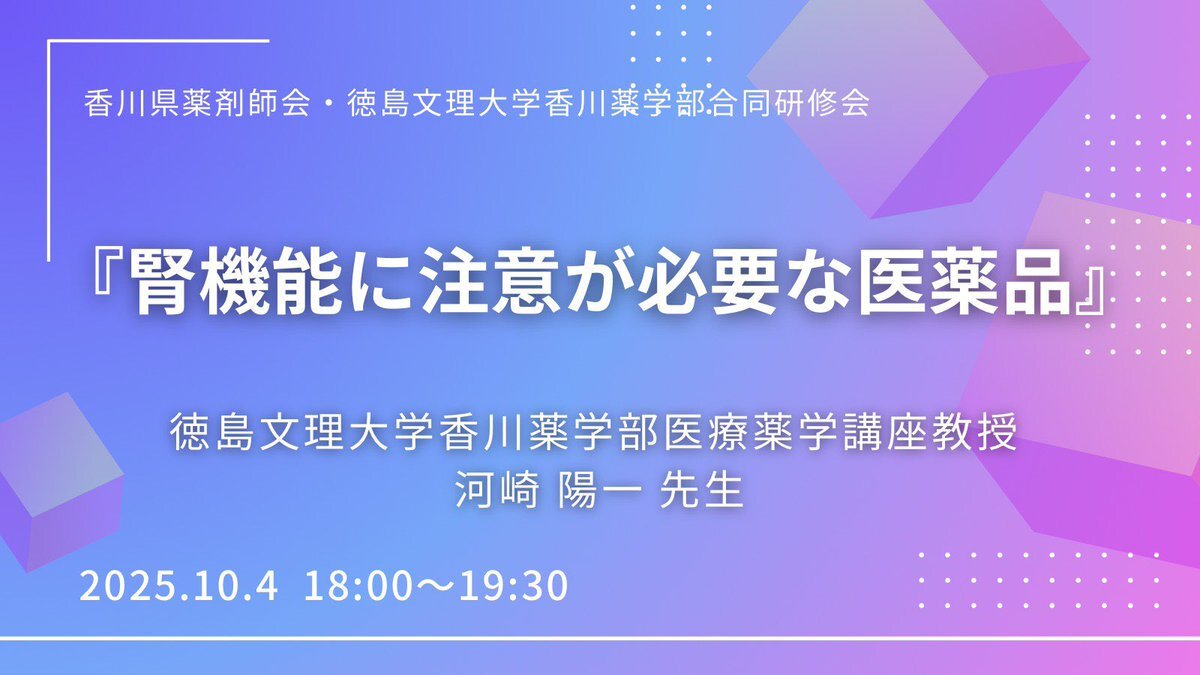 【会員向け】 💊香川県薬剤師会生涯教育部です💊 10月4日(土)18:00〜19:30 香川県薬剤師会・徳島文理大学香川薬学部合同研修会を開催します✨ 演題は『腎機能に注意が必要な医薬品』で、徳島文理大学香川薬学部医療薬学講座 教授 河崎 陽一 先生にご講演いただきます📚 #研修会 #薬剤師 pic.x.com/0IaD1KucQM