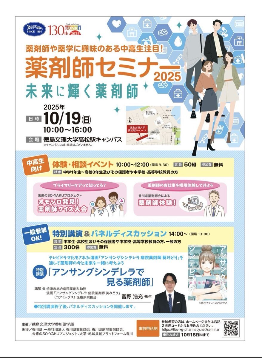 また、「アンサングシンデレラで見る薬剤師」と題して特別講演も開催されます。こちらは一般の方もご参加いただけます。 事前申し込みが必要ですので、詳しくは徳島文理大学香川薬学部のホームページをご確認ください。 bunri-u.ac.jp/faculty/kg-pha… #薬剤師 #徳島文理大学 #薬学部